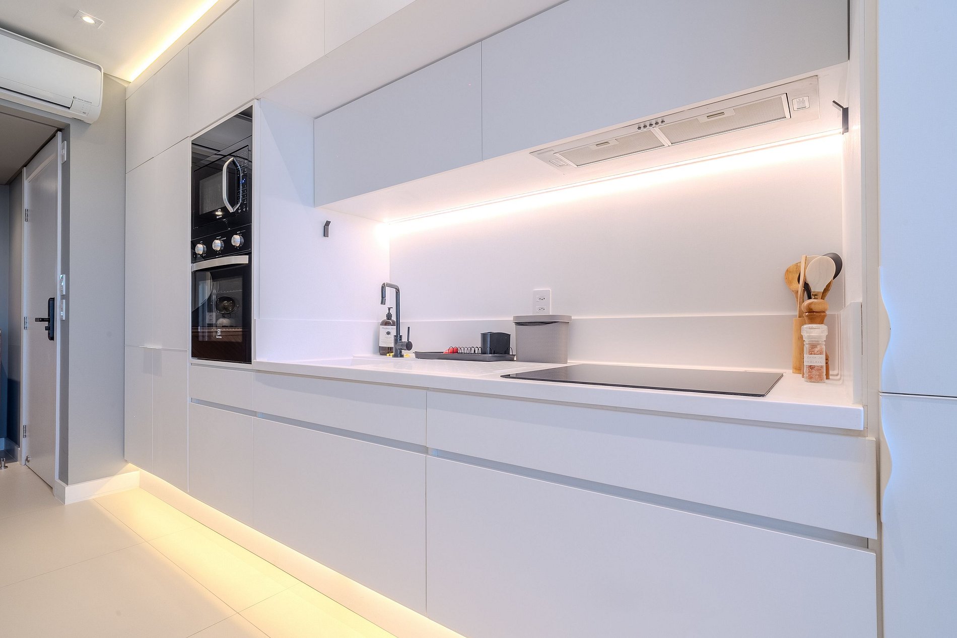 - Cozinha completa com cafeteira, geladeira com congelador embutida, liquidificador, sanduicheira, utensílios de cozinha e jogo de panelas