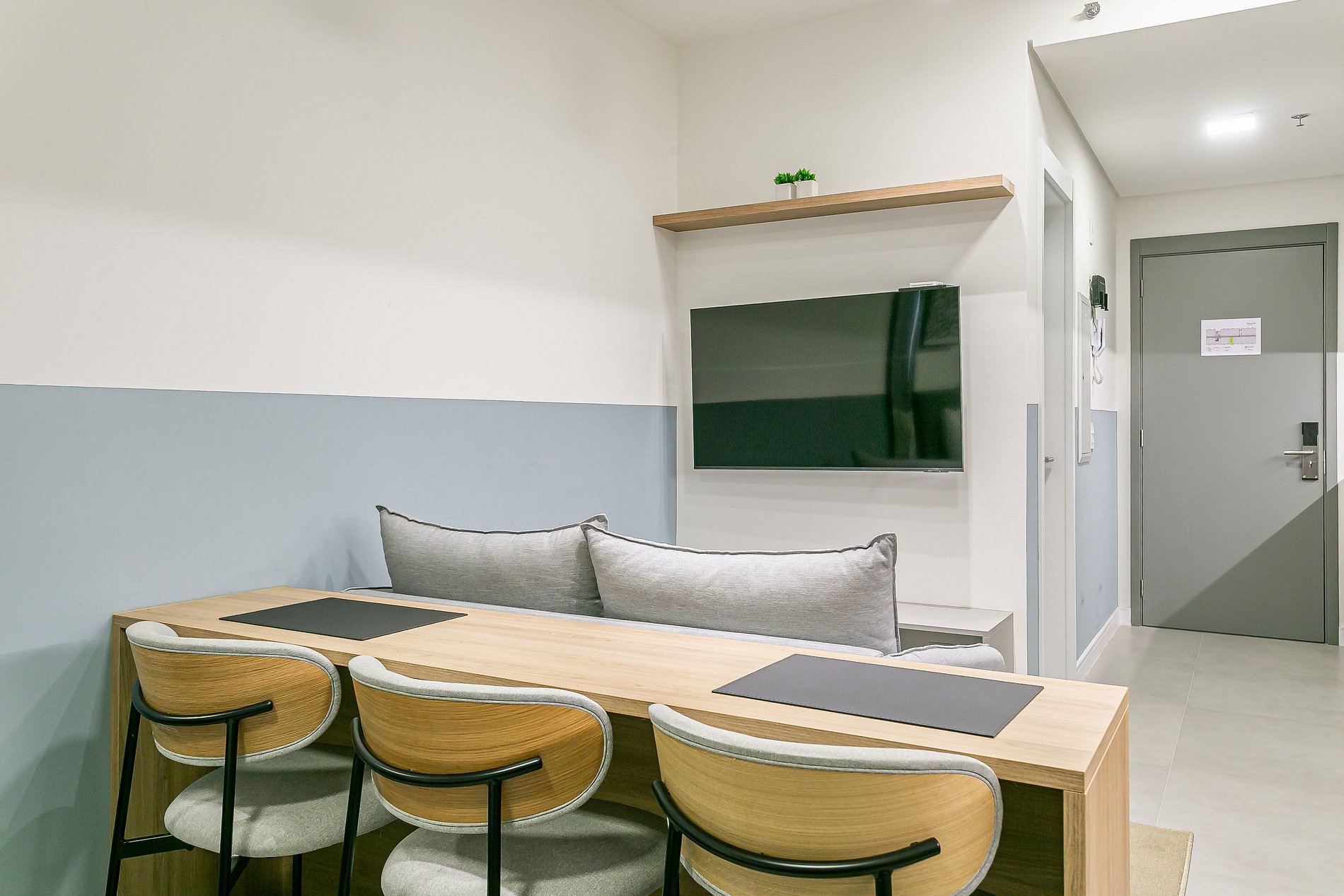 O imóvel de 31,05 m² conta com uma CAMA QUEEN, SMART TV DE 50" E AC SPLIT (QUENTE E FRIO).