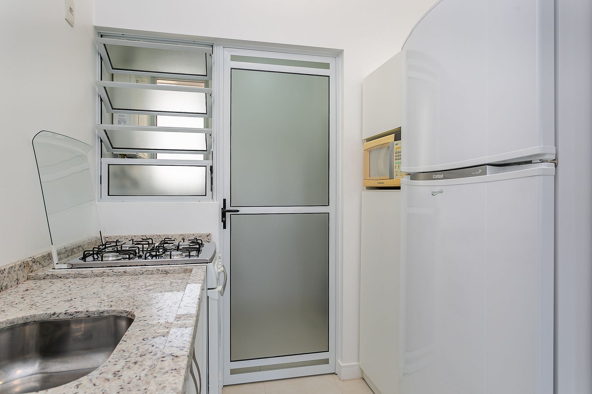 - Cozinha completa com cafeteira, geladeira com congelador, liquidificador, micro-ondas, sanduicheira, utensílios de cozinha e jogo de panelas