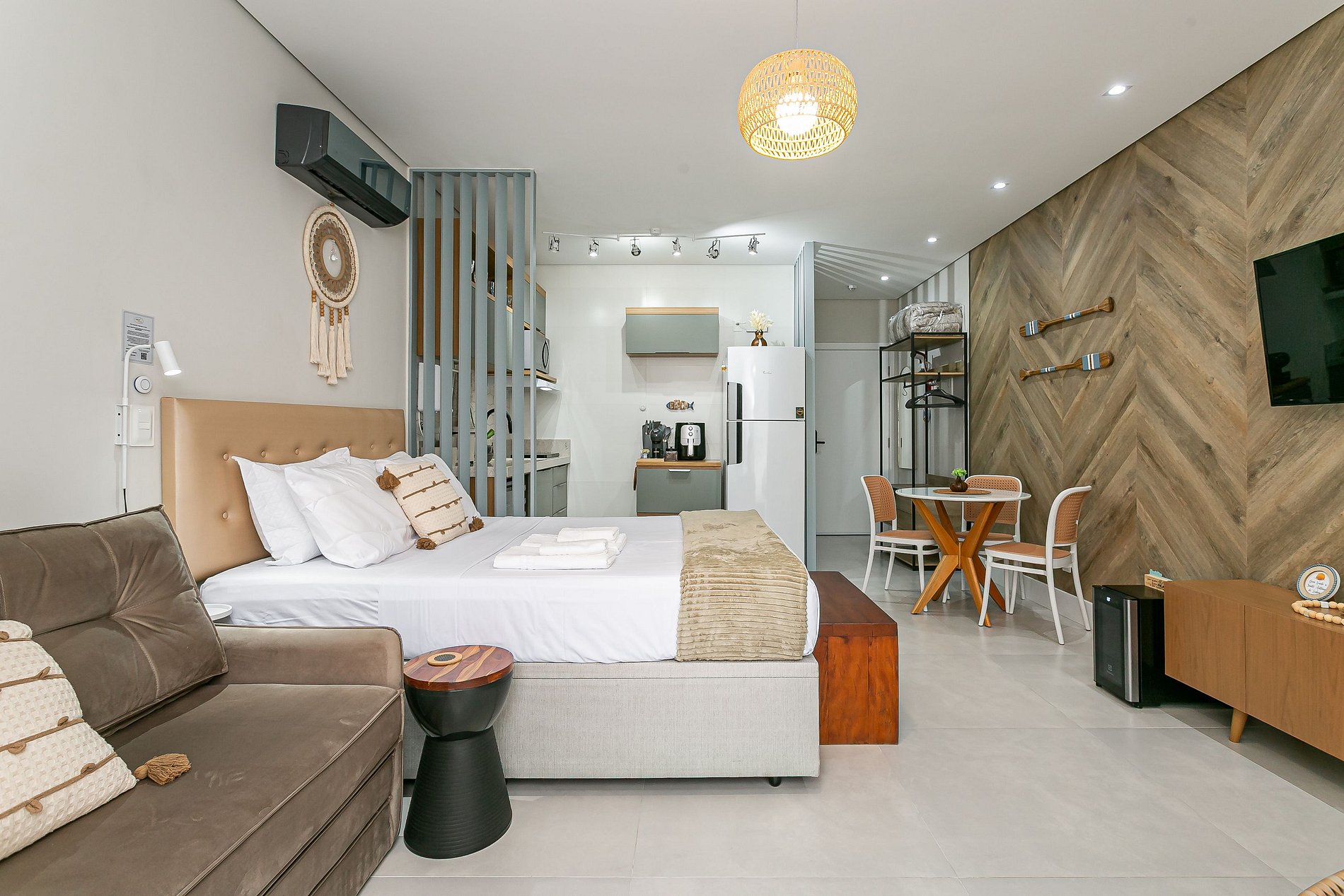 O imóvel de 34m² conta com uma CAMA QUEEN, SOFÁ CAMA CASAL SMART TV DE 43" E AC SPLIT (QUENTE E FRIO).
