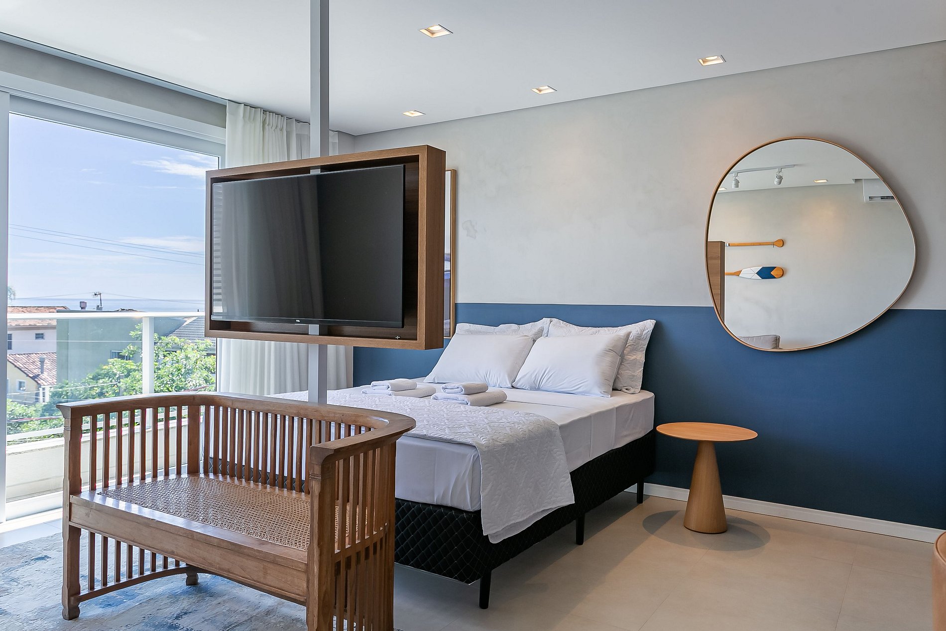 O imóvel de 42m² conta com uma cama QUEEN, um sofá-cama de SOLTEIRO e uma Smart TV. Além disso, o studio conta com um Ar-condicionado SPLIT.