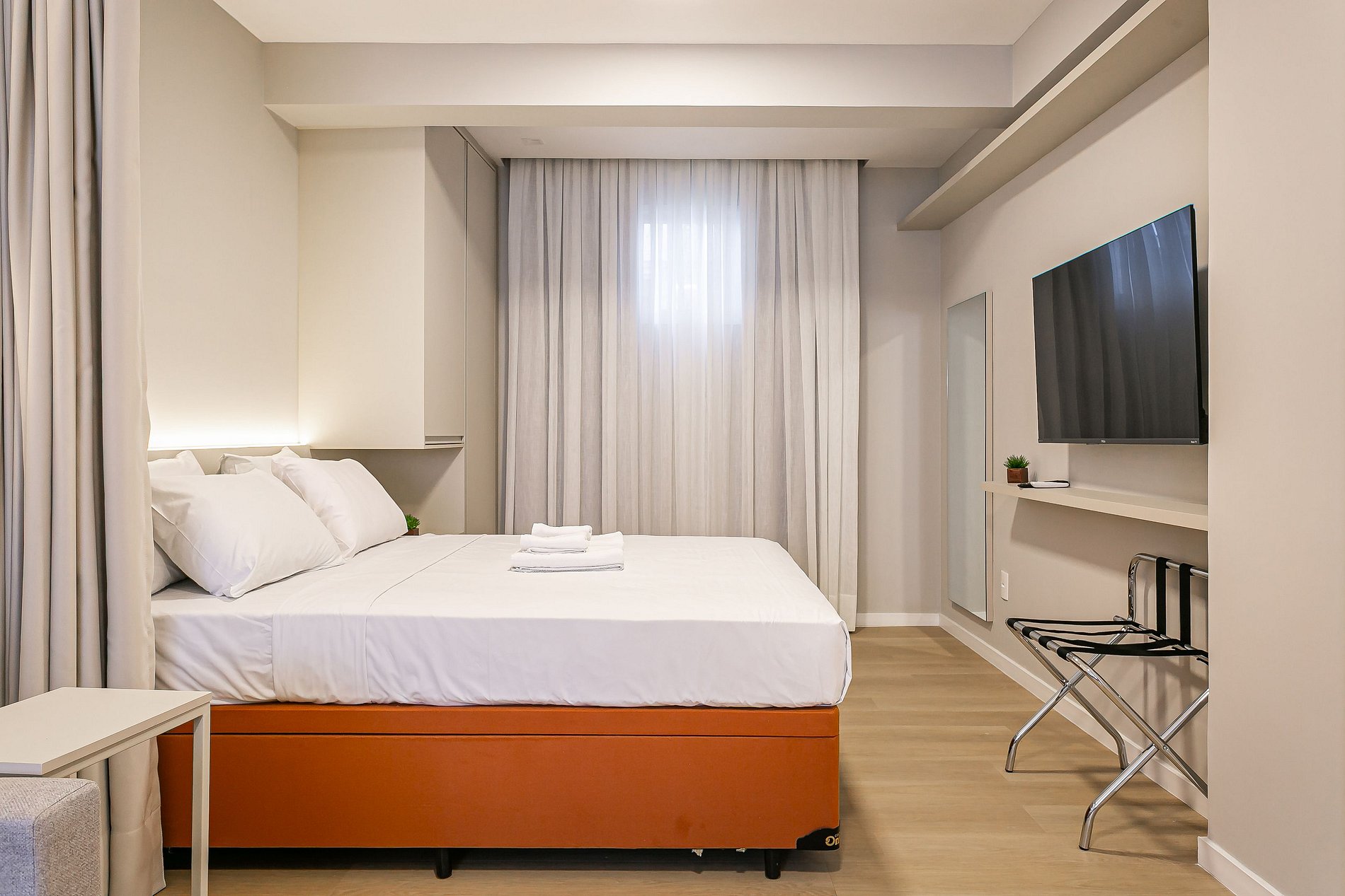 O Studio possui área de diversos tamanhos. Sendo equipado com cama CASAL, televisão SMARTV e ar-condicionado.