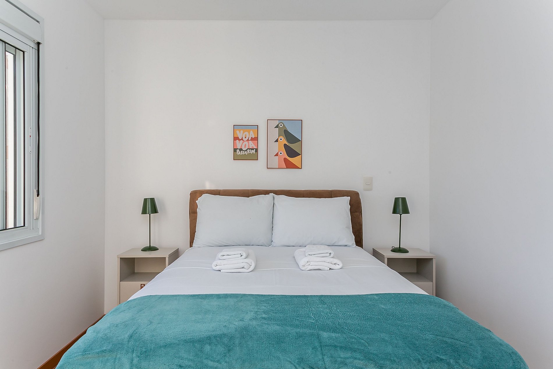 O imóvel de 66,44m² dispõe de uma suíte com cama de CASAL, um quarto com cama de CASAL, uma sala de estar com TV e uma sacada com churrasqueira. Todos os cômodos possuem ar-condicionado SPLIT.
