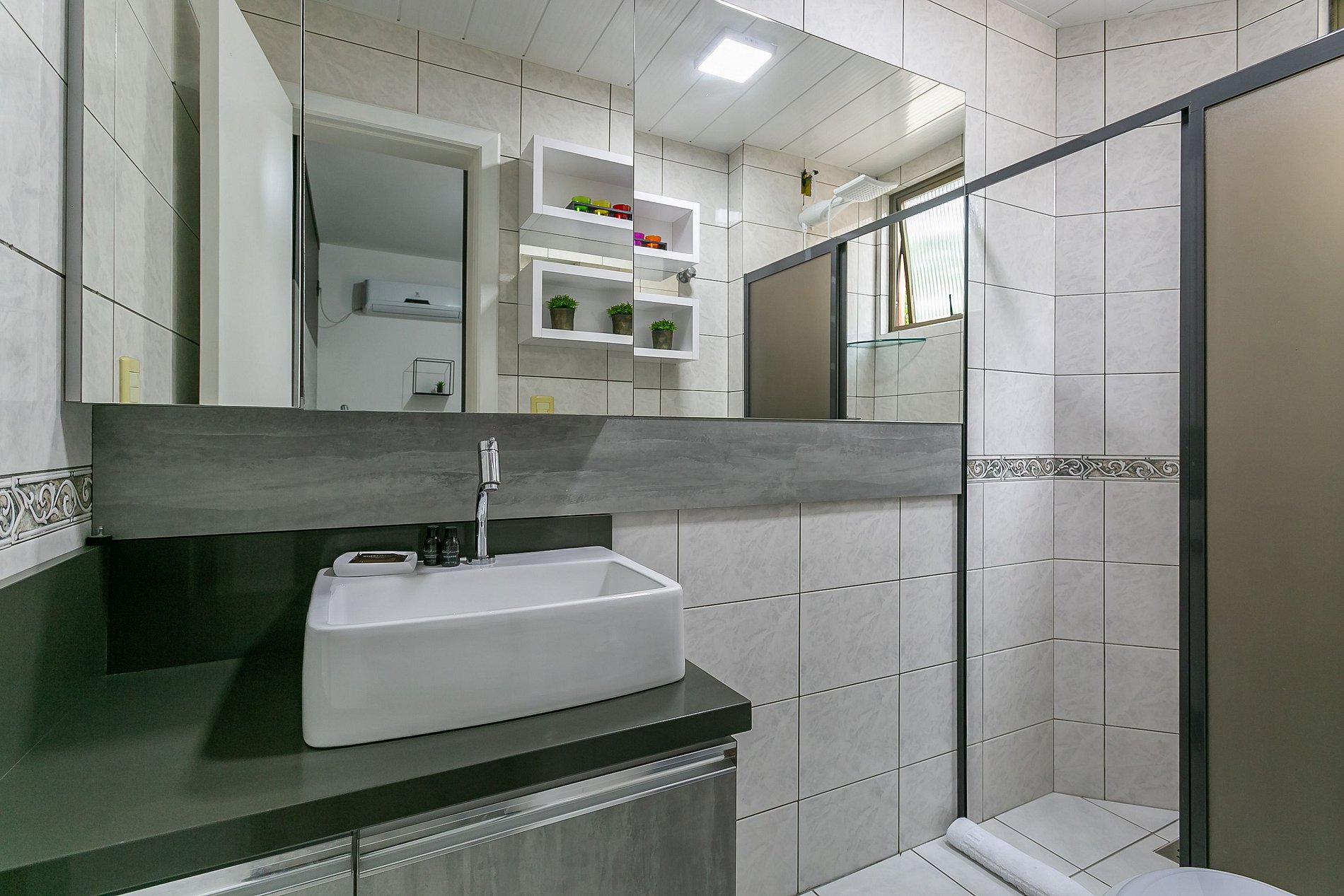 - 01 BANHEIRO equipados com chuveiro e secador de cabelo (além do banheiro da suíte)