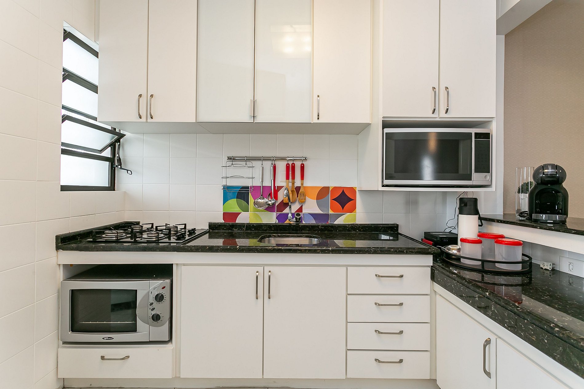 - Cozinha completa com cafeteira, geladeira com congelador, liquidificador, micro-ondas, sanduicheira, utensílios de cozinha e jogo de panelas