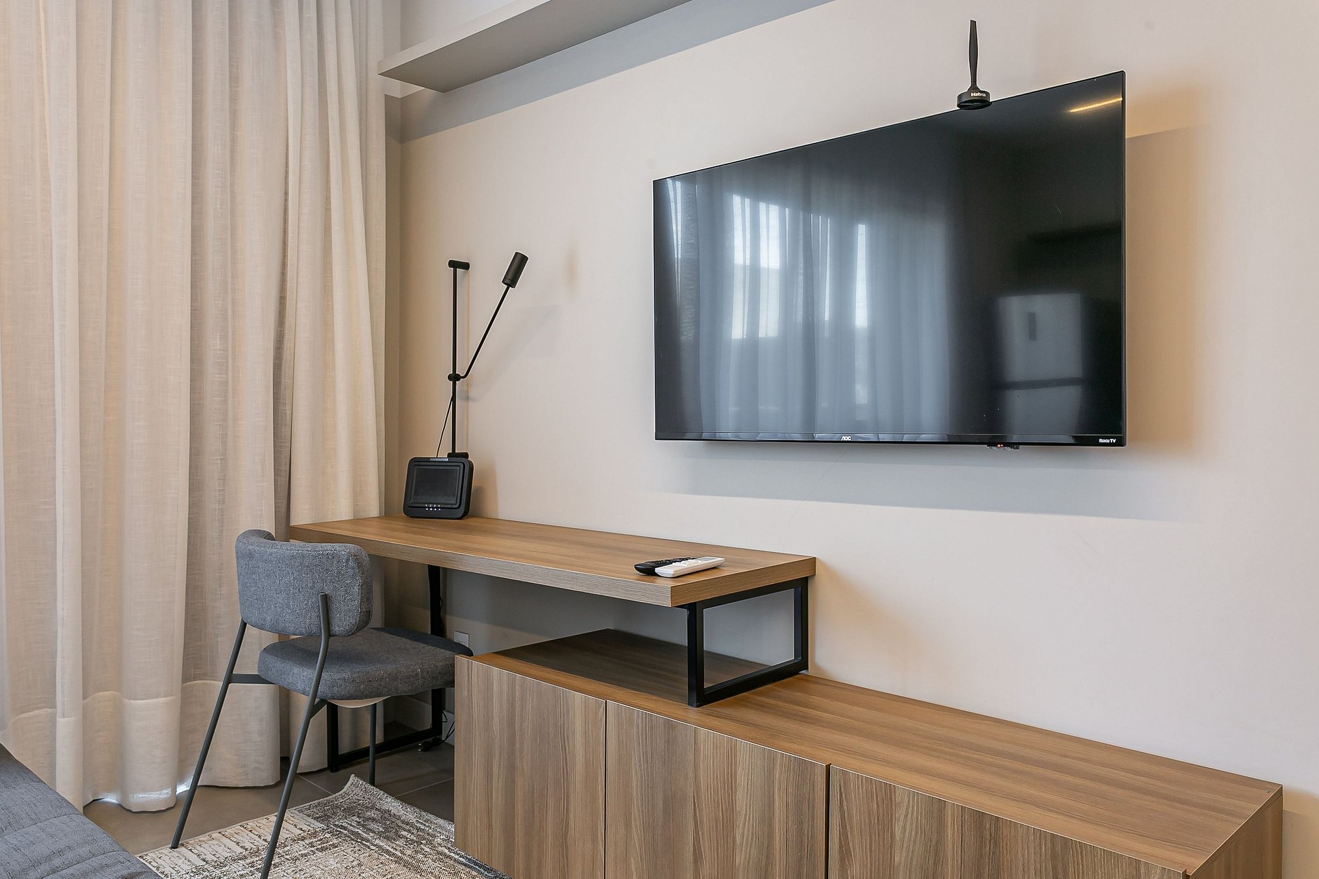 O studio de 44m² conta com uma cama QUEEN, uma Smart TV de 43" e AC SPLIT.