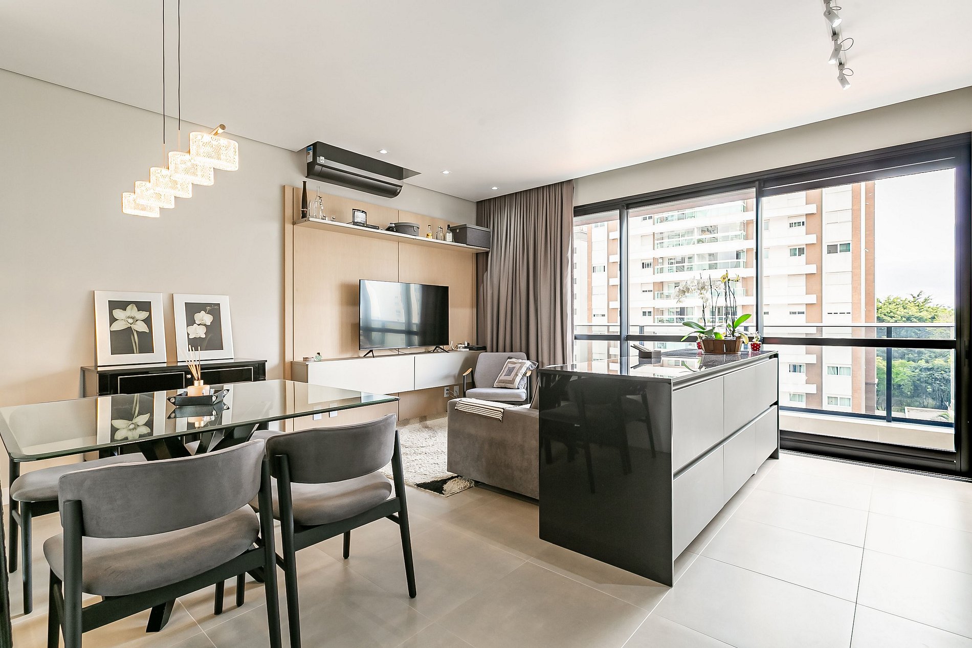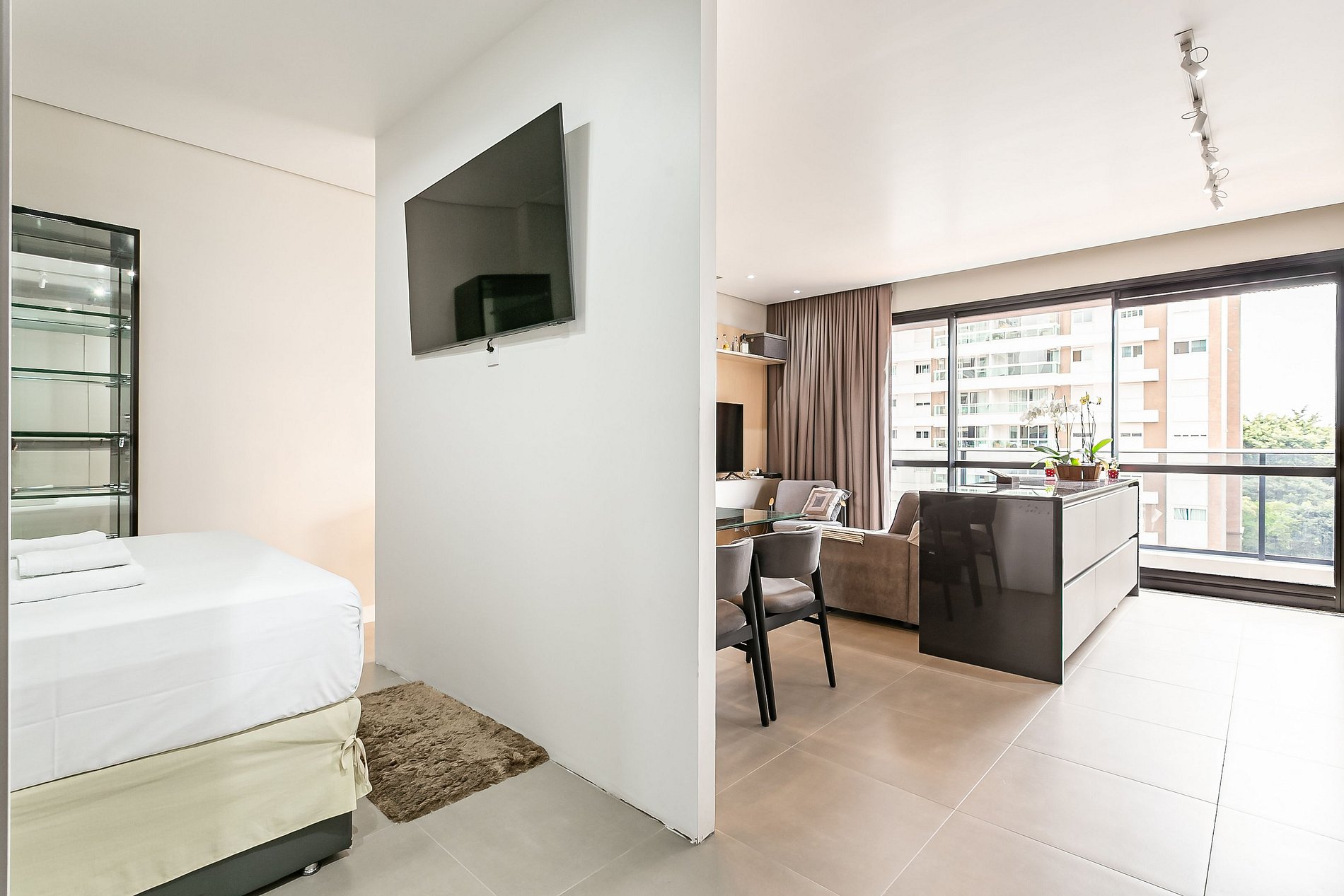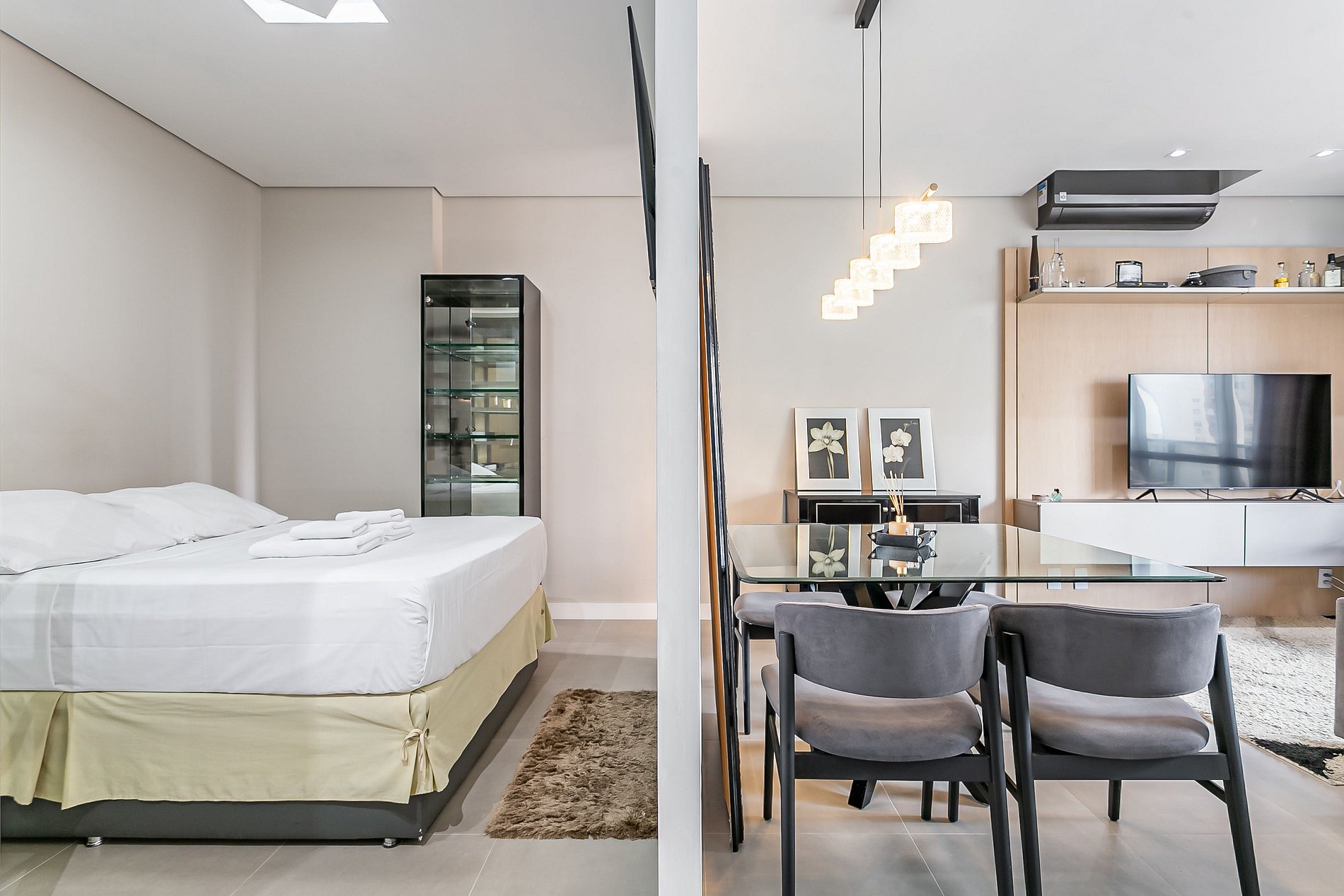 O studio de 53m² conta com uma cama QUEEN, duas Smart TVs de 55" e AC SPLIT (QUENTE E FRIO).