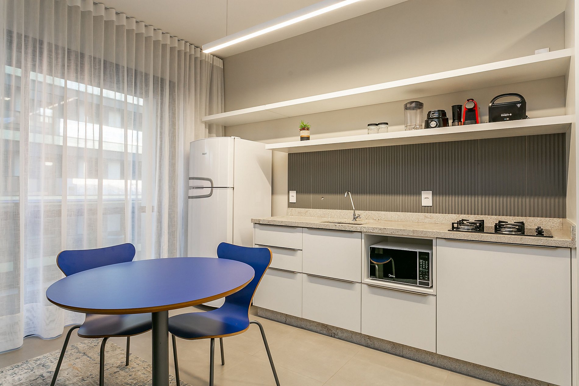 - Cozinha completa com cafeteira Nespresso de cápsula, geladeira com congelador, liquidificador, micro-ondas, sanduicheira, utensílios de cozinha e jogo de panelas