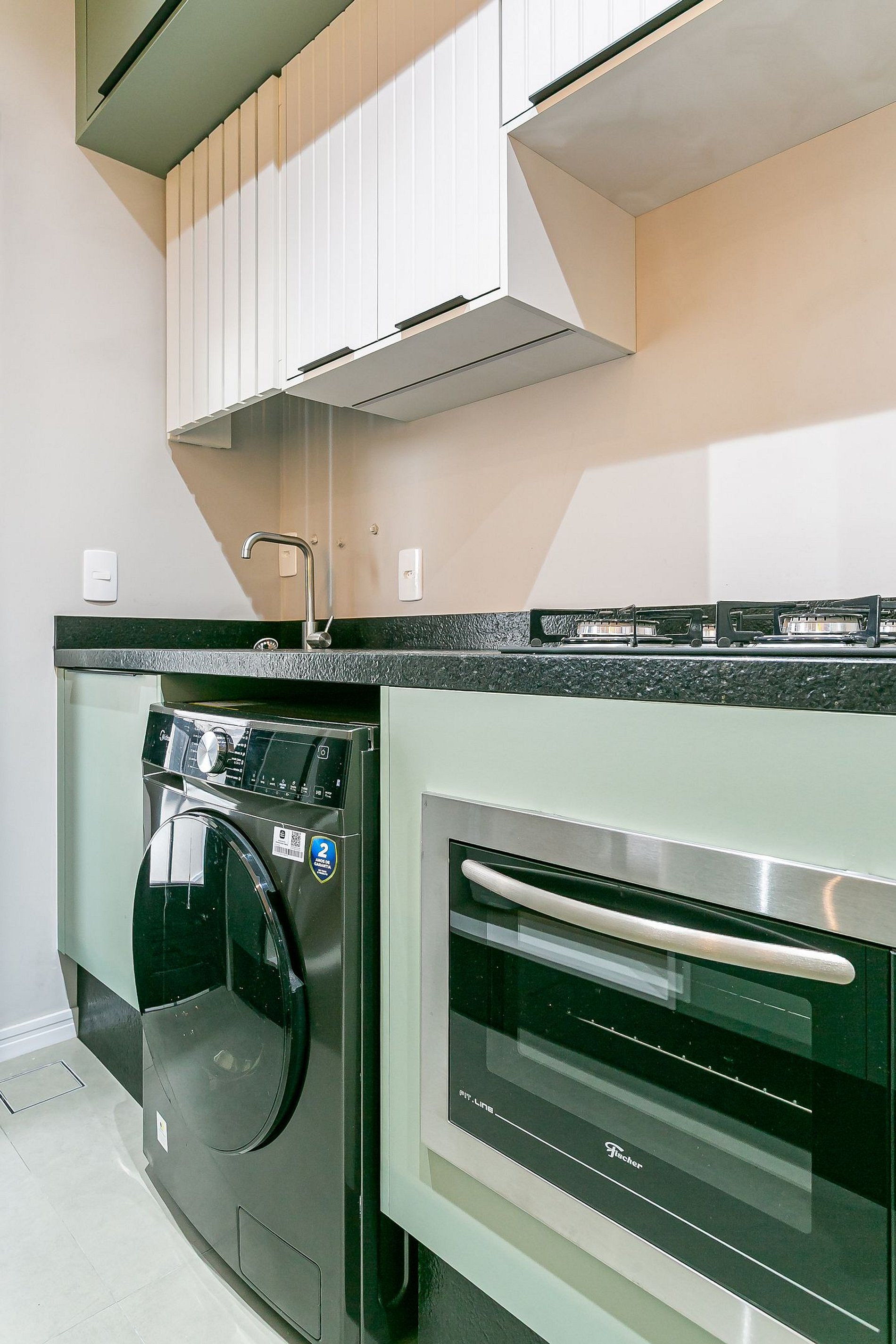 - Cozinha completa com cafeteira, geladeira com congelador, liquidificador, micro-ondas, sanduicheira, utensílios de cozinha e jogo de panelas