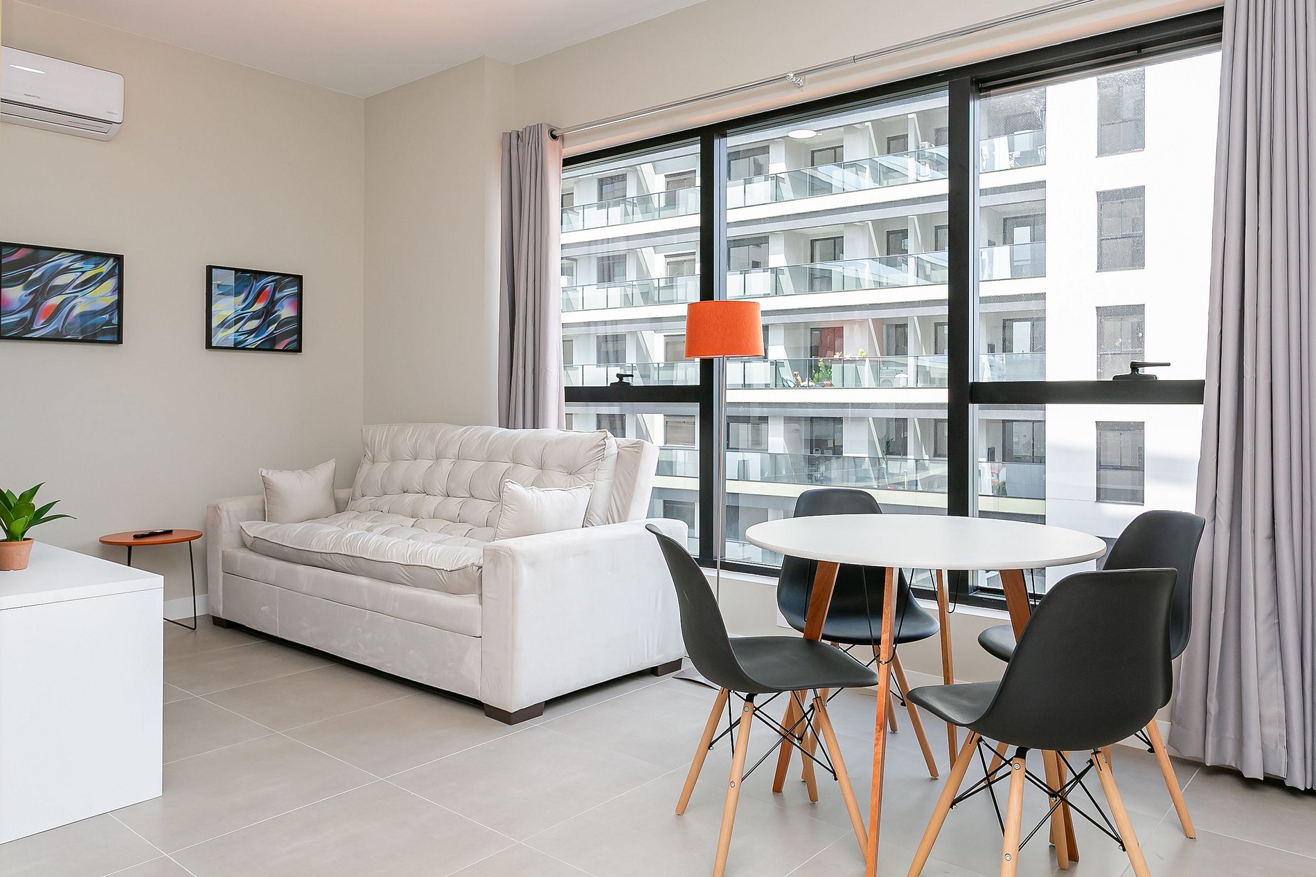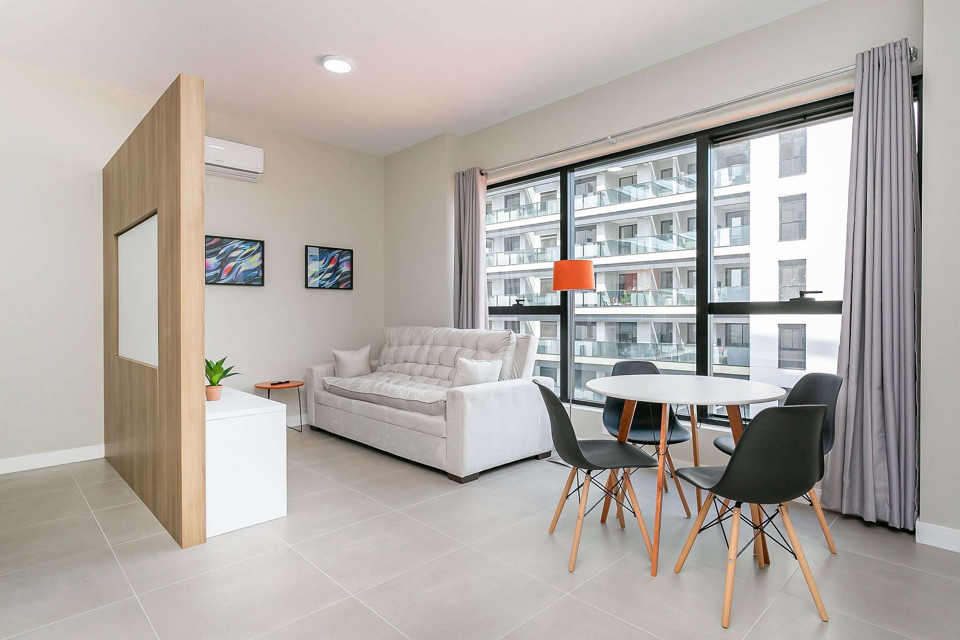 O imóvel de 44m² conta com uma cama de CASAL, um sofá-cama de CASAL, Smart TV e ar-condicionado SPLIT.