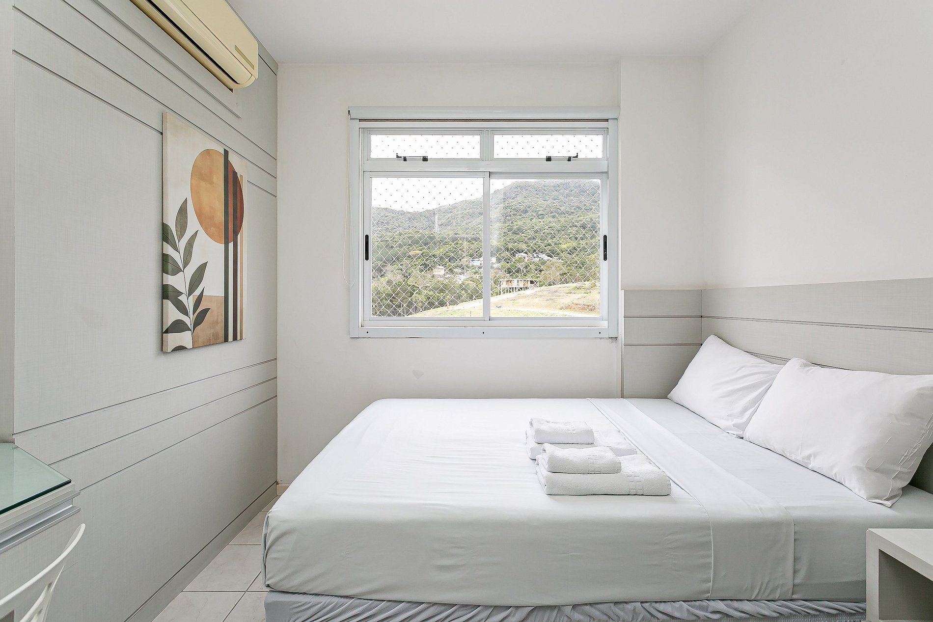 O imóvel de 74m² conta com uma suíte com uma CAMA QUEEN, um quarto com uma CAMA DE CASAL, sala de estar com SMART TV DE 32" e uma varanda com churrasqueira. Todos os quartos possuem AC SPLIT.
