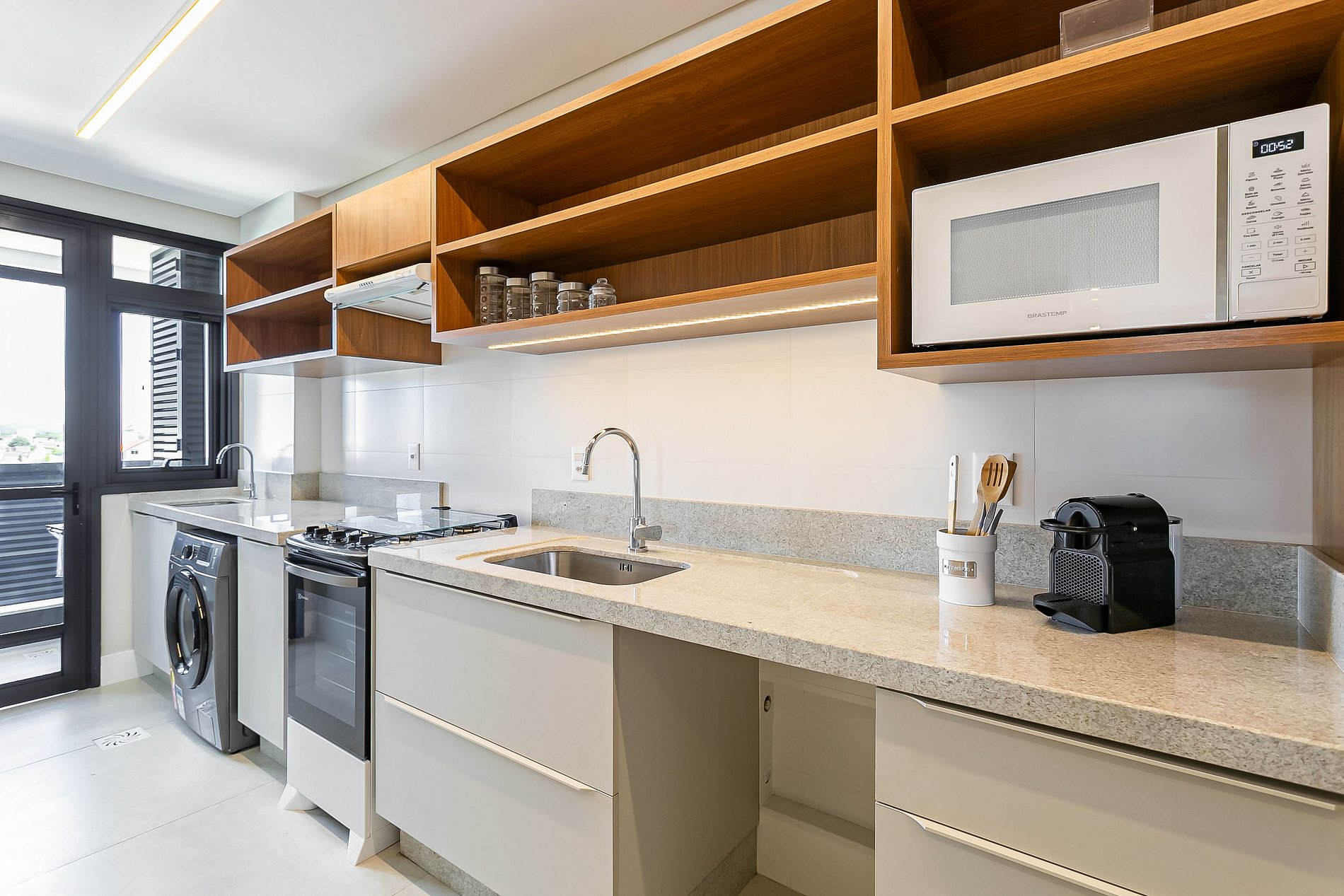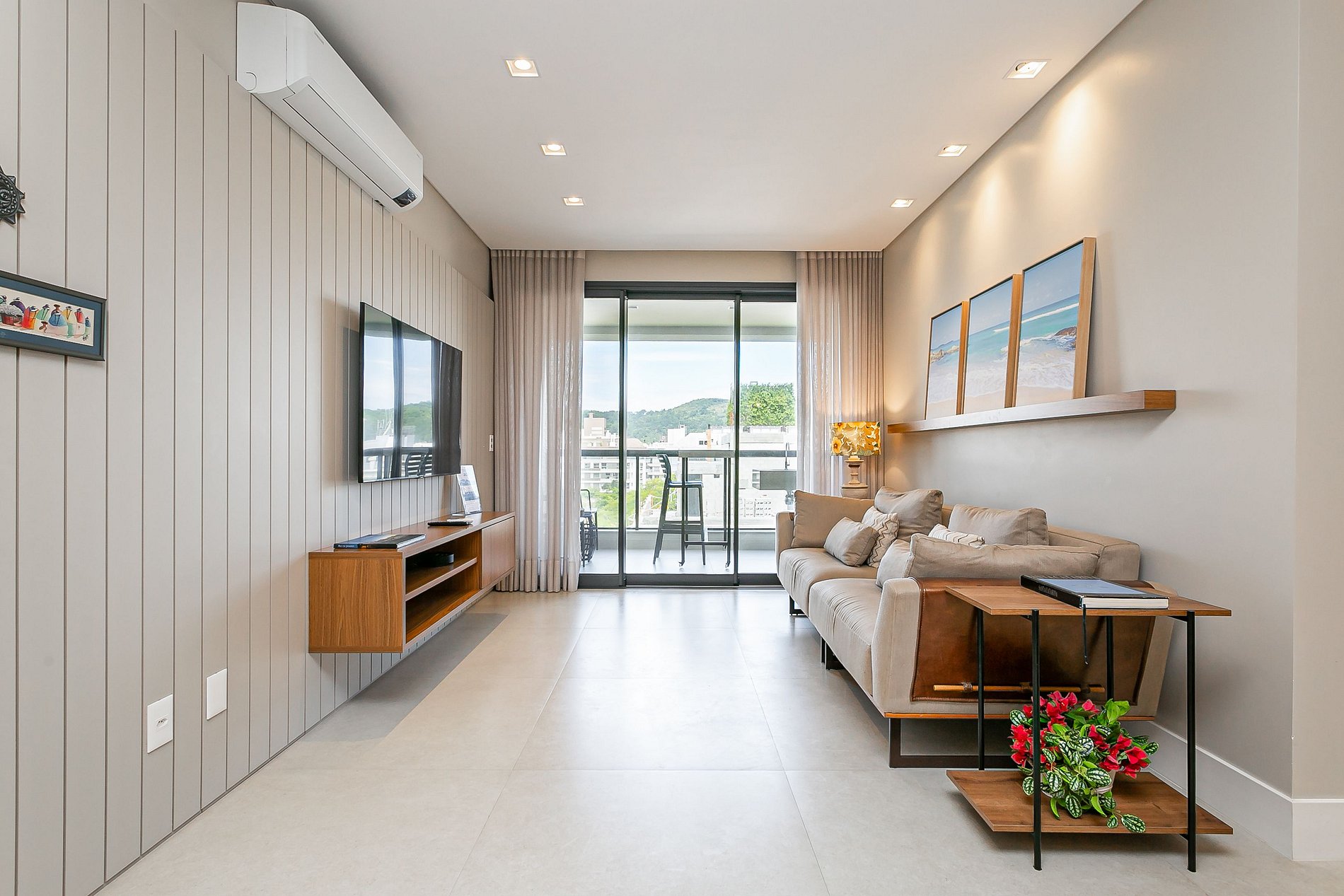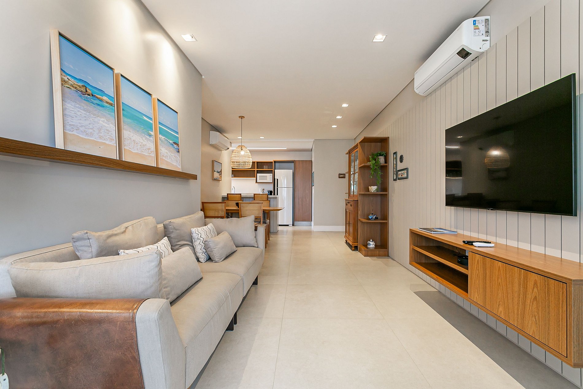 O imóvel de 92,81m² conta com duas Suítes, uma sala com Smart TV e uma sacada com churrasqueira. Todos os cômodos são equipados com Ar-condicionado Split.