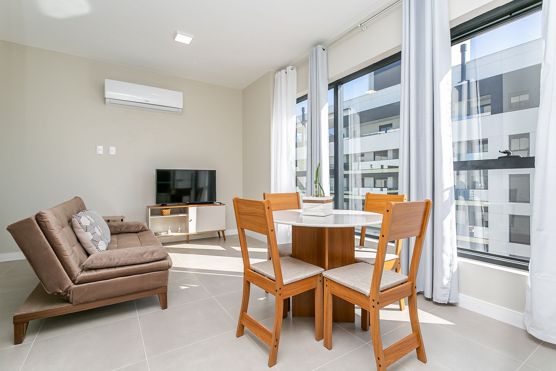 O imóvel de 44m² e conta com uma cama QUEEN, um Sofá-cama de SOLTEIRO e ar-condicionado SPLIT.