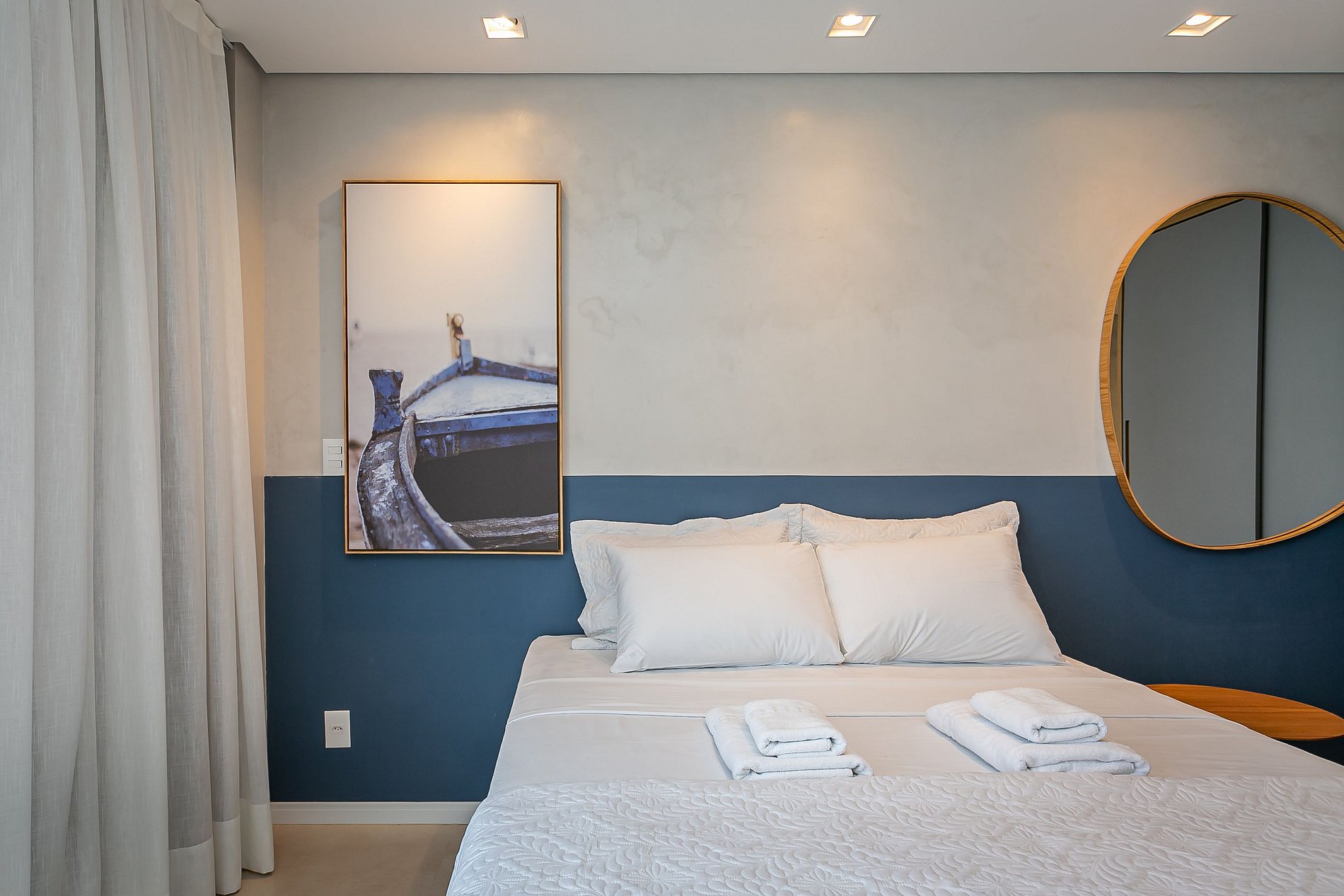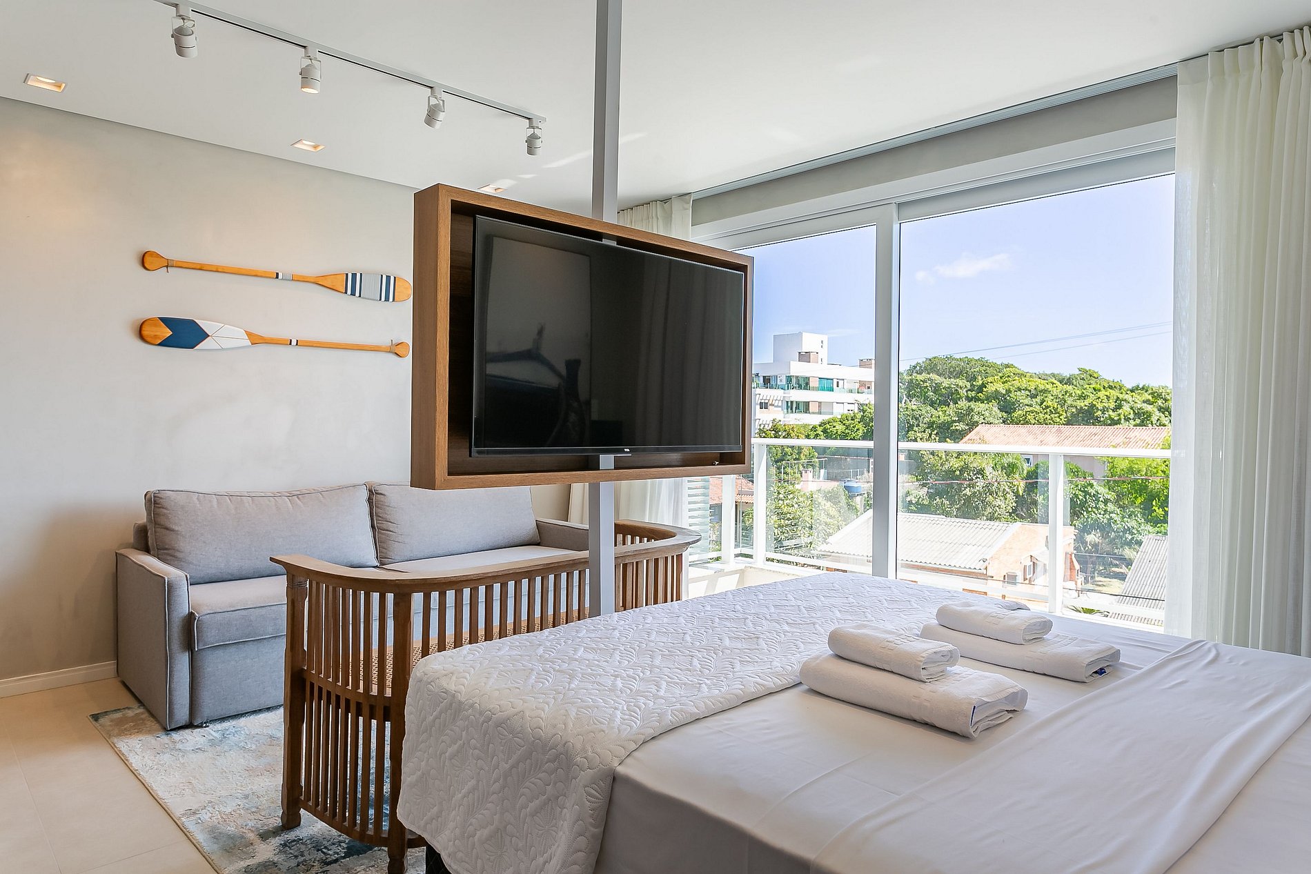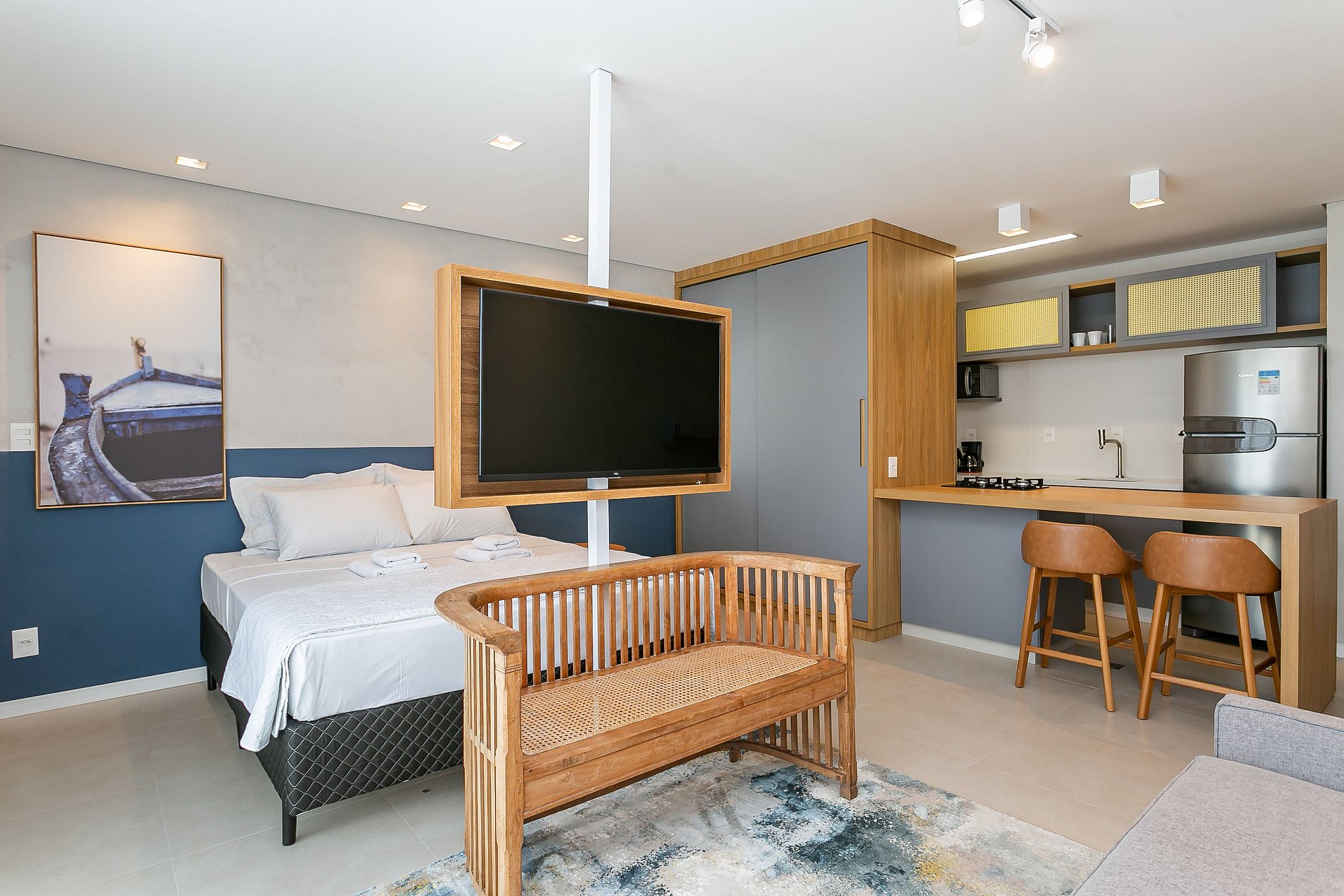 O imóvel de 42m² conta com uma cama QUEEN, um sofá-cama de SOLTEIRO e uma Smart TV. Além disso, o studio conta com um Ar-condicionado SPLIT.