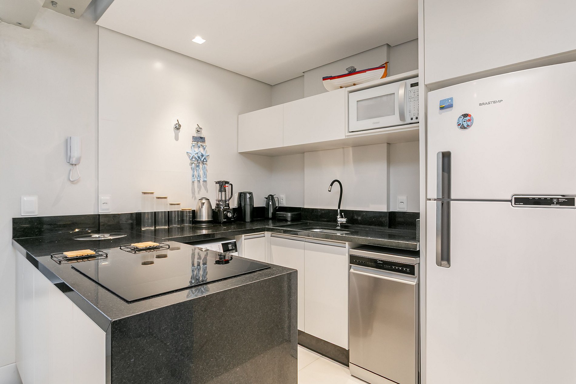 - Cozinha completa com geladeira com congelador, micro-ondas, utensílios de cozinha e jogo de panelas