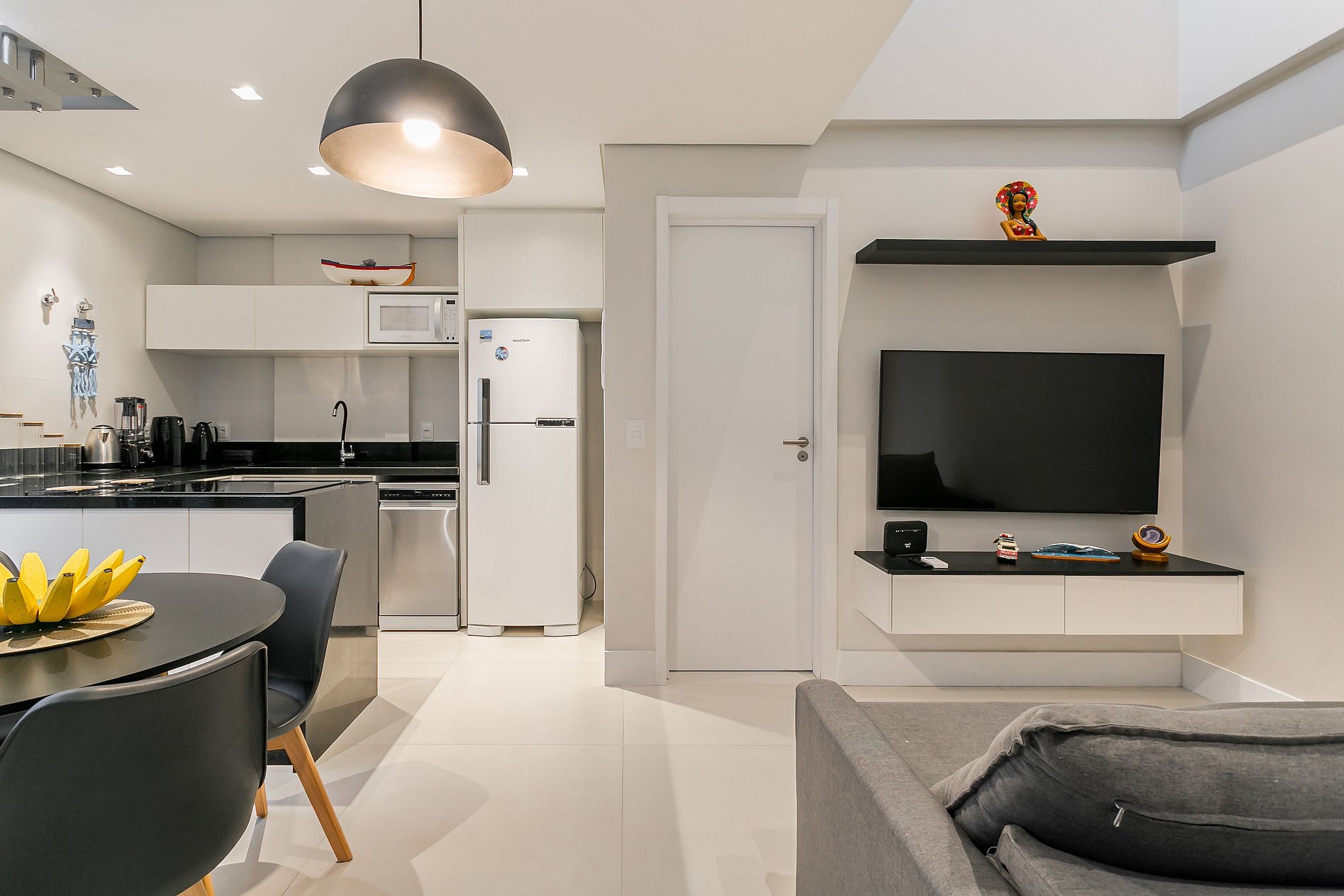 O imóvel de 46,65m² conta com uma SUÍTE COM UMA CAMA DE CASAL E TV DE 43", ALÉM DE UMA SALA DE ESTAR COM SOFÁ-CAMA DE CASAL E SMART TV DE 55". Todos os cômodos possuem AC SPLIT (SÓ FRIO).