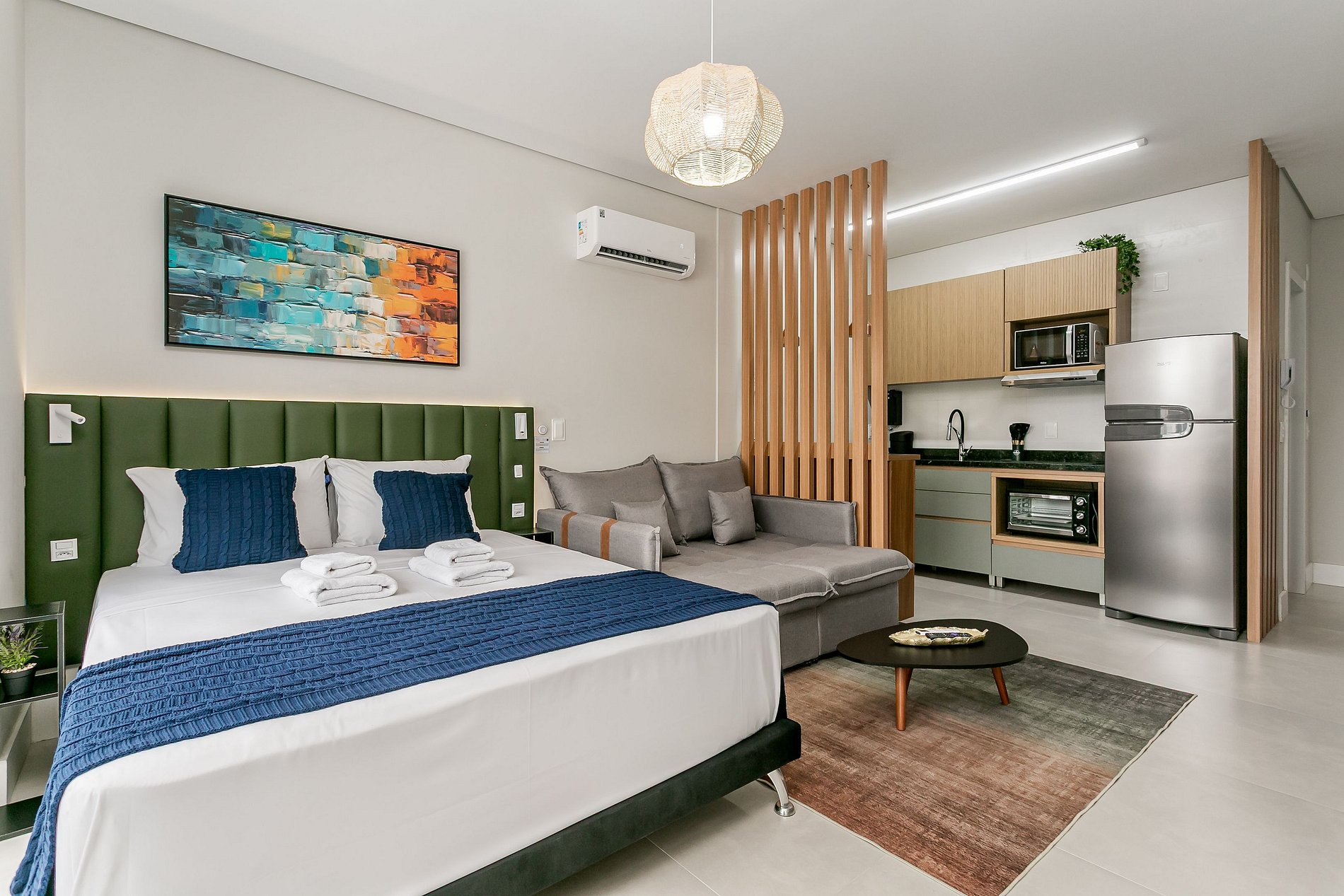 O imóvel de 30m² conta COM UMA CAMA QUEEN, ALÉM DE UMA SALA DE ESTAR COM SOFÁ E SMART TV DE 50". Todos os cômodos possuem AC SPLIT (SÓ FRIO).