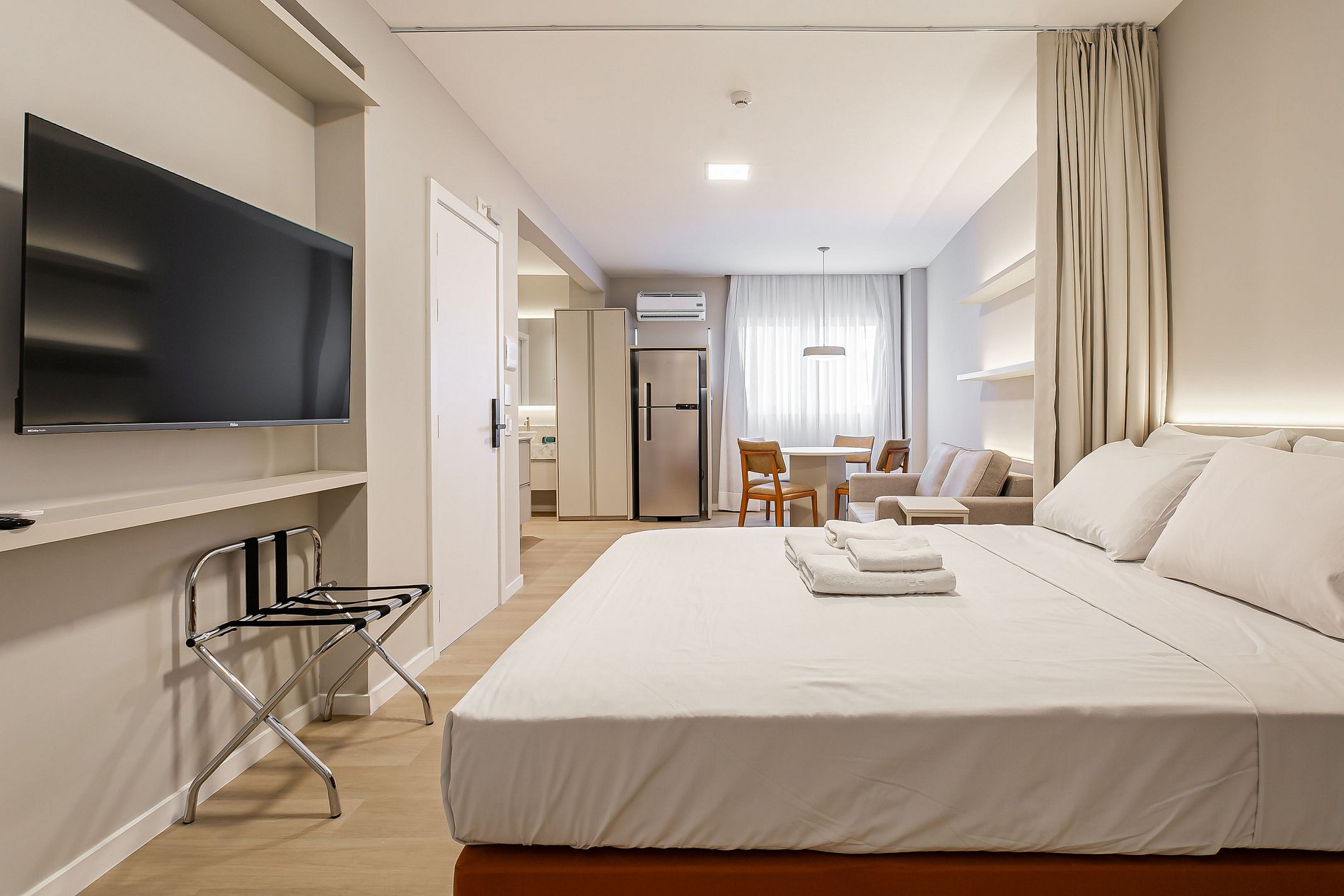 O Studio possui área de diversos tamanhos. Sendo equipado com cama CASAL, televisão SMARTV e ar-condicionado.