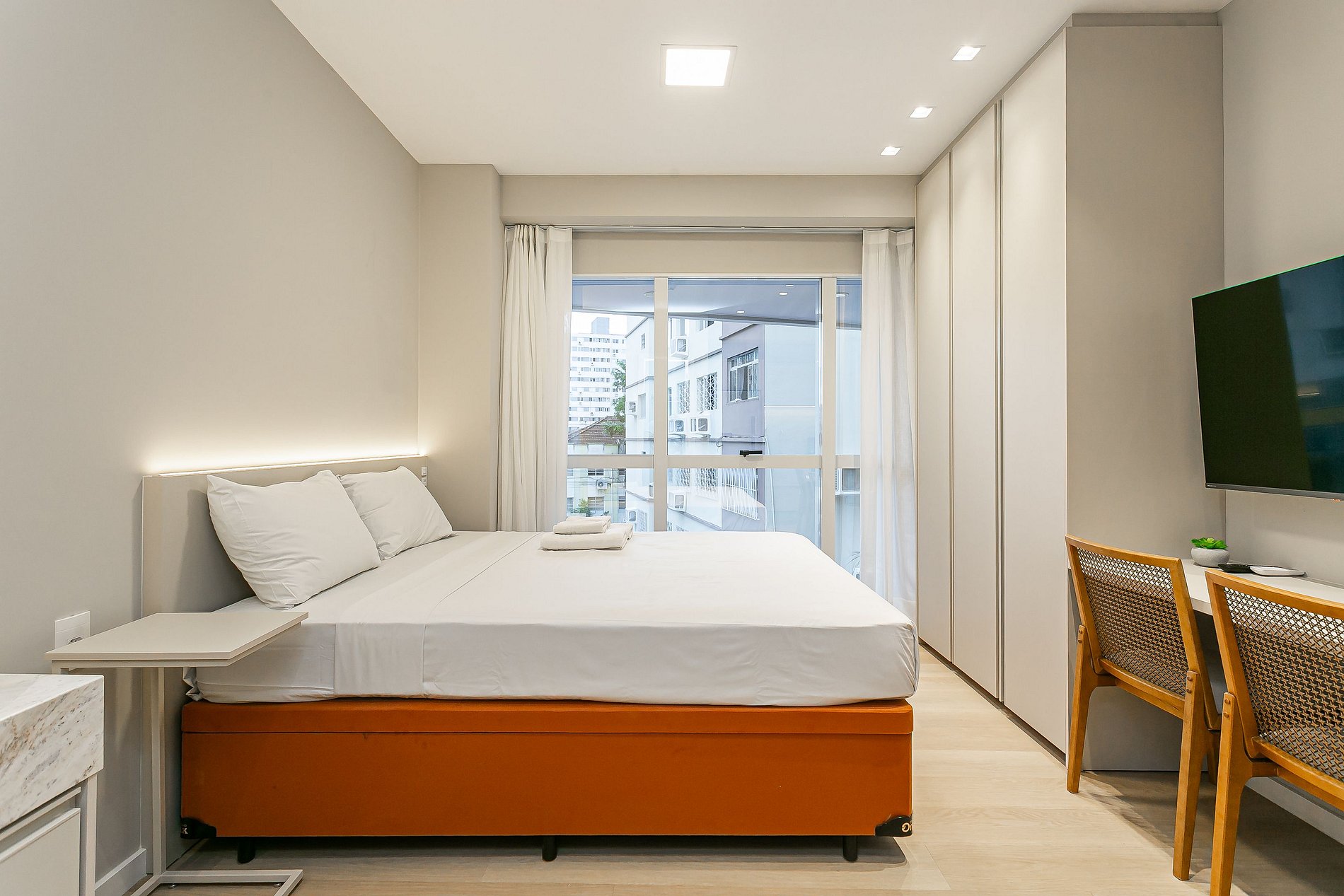 O Studio possui área de diversos tamanhos. Sendo equipado com cama CASAL, televisão SMARTV e ar-condicionado.