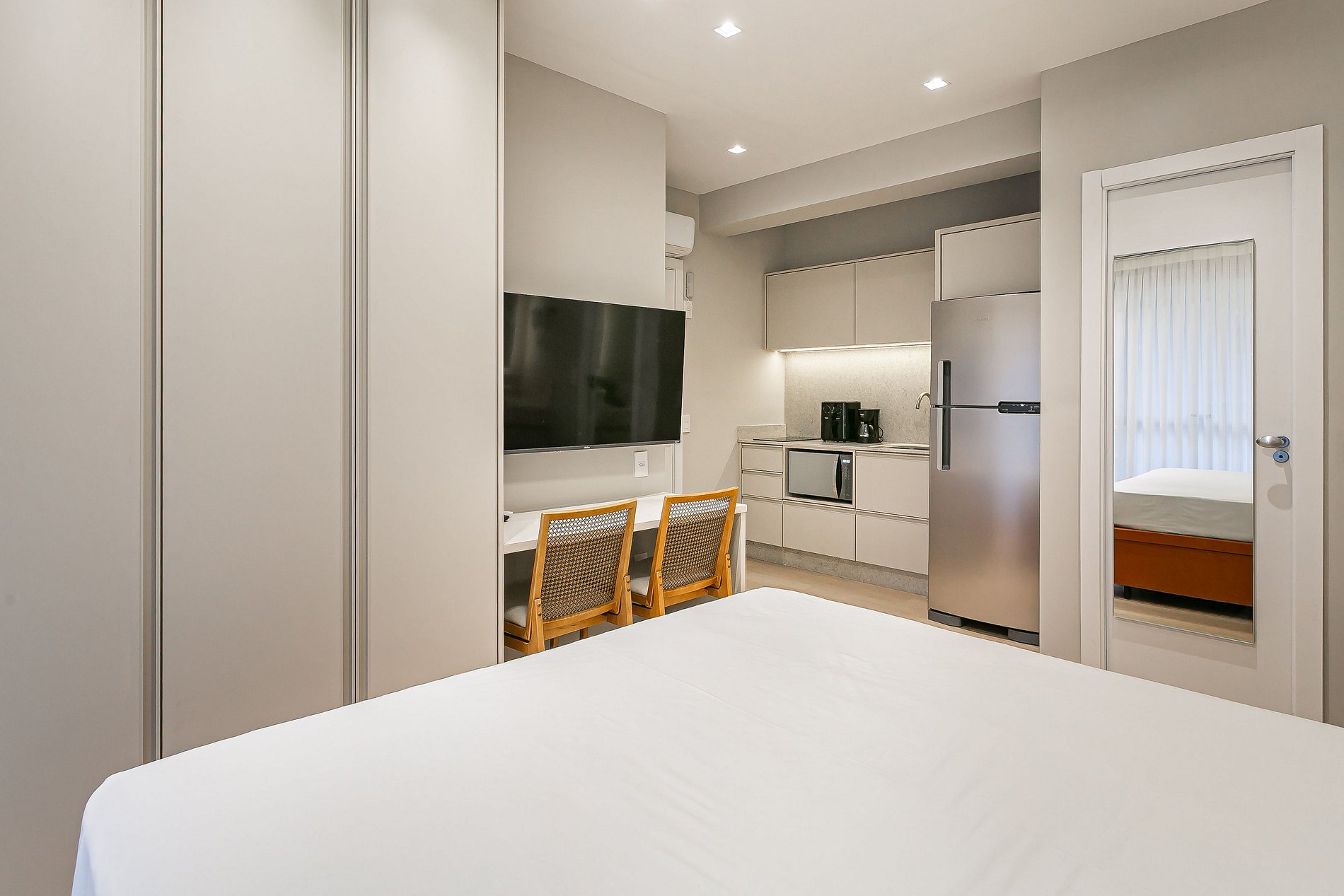 O imóvel de 17.6m² conta com uma cama de CASAL, SmarTV e Ar-condicionado.