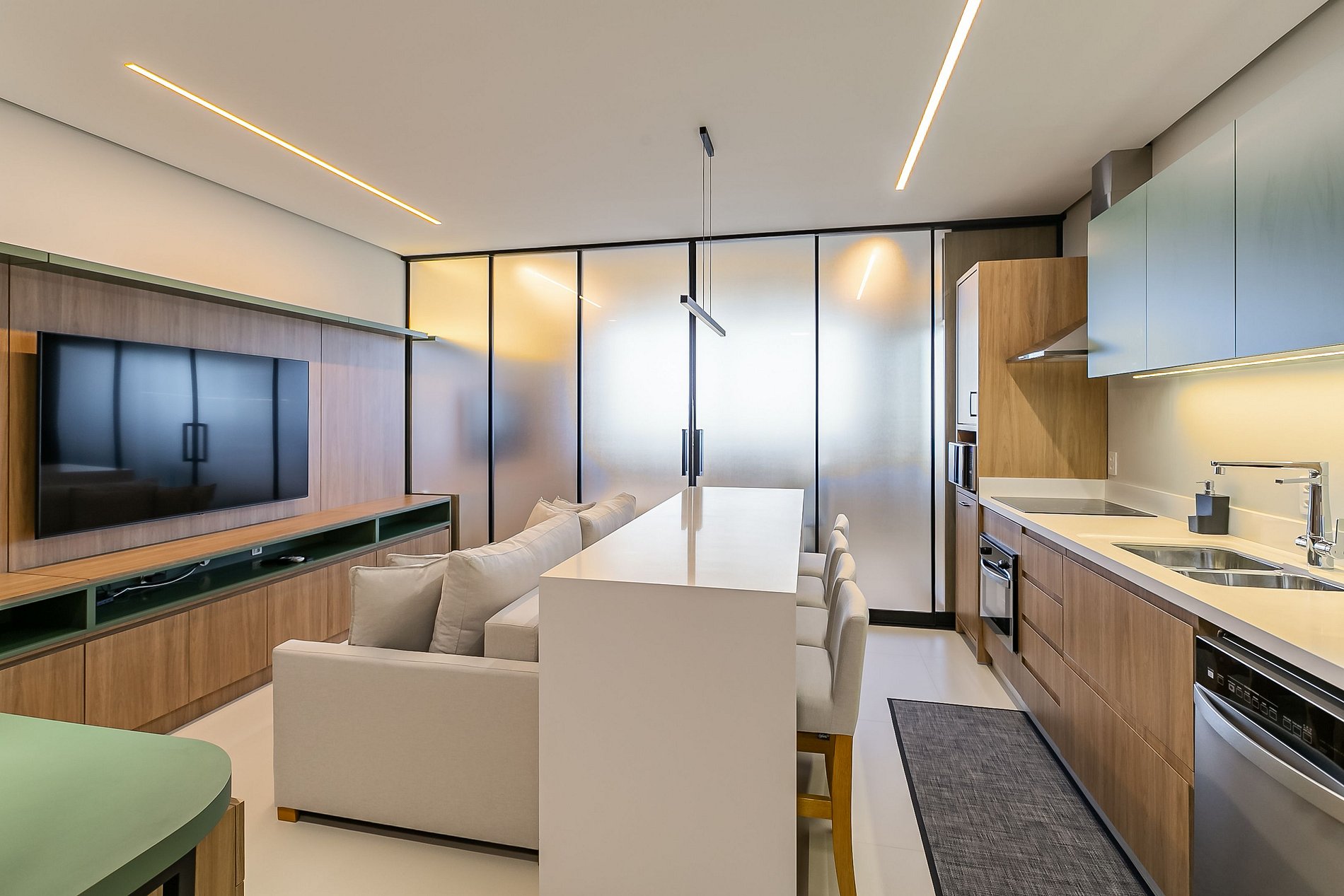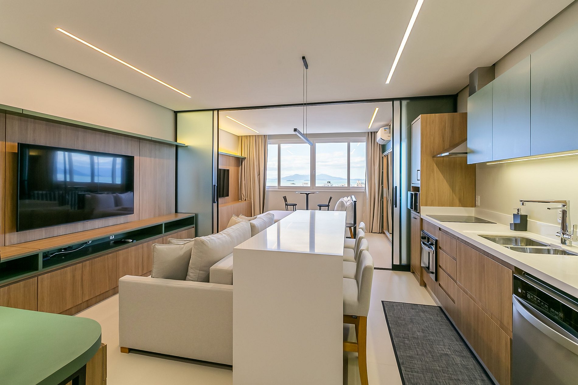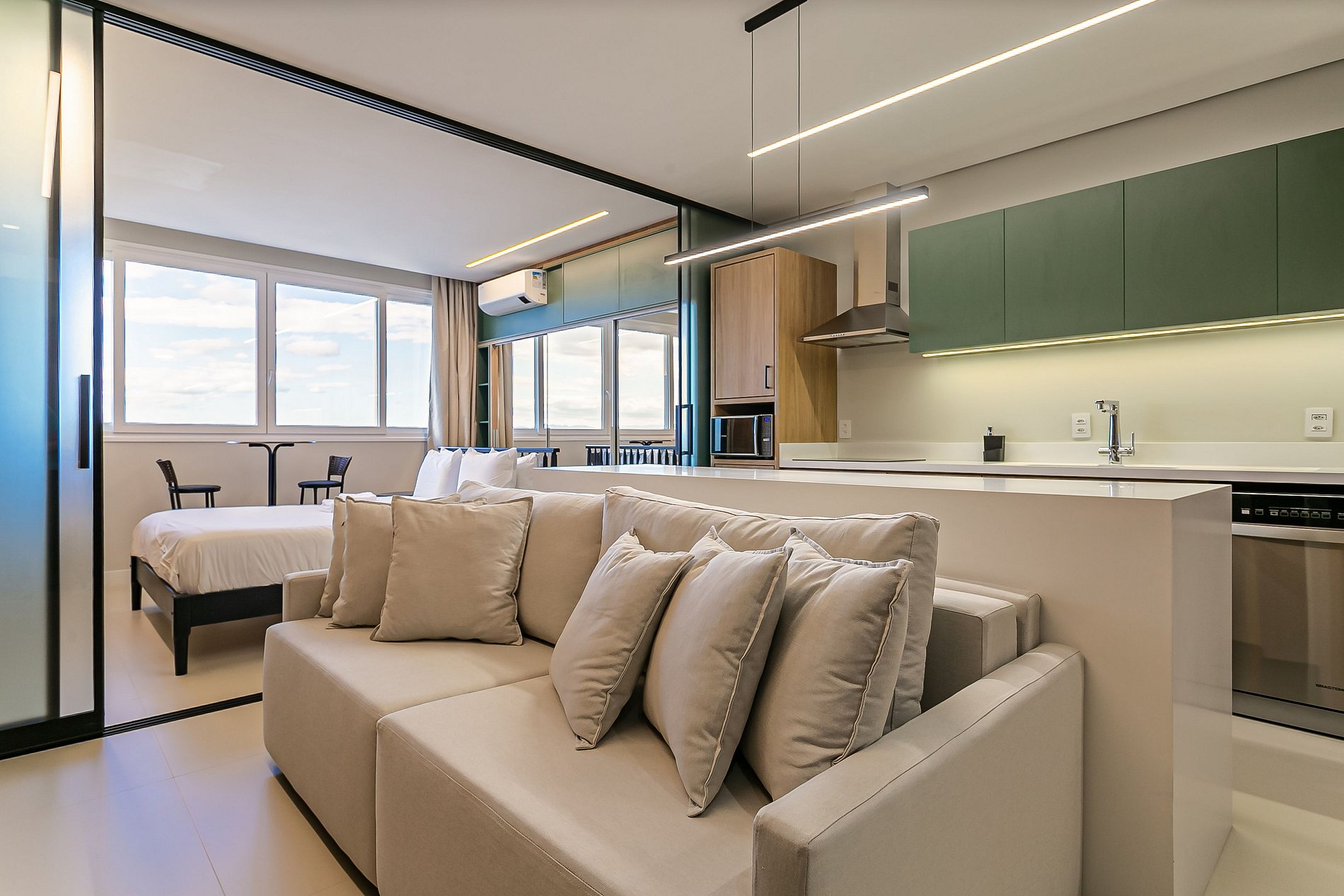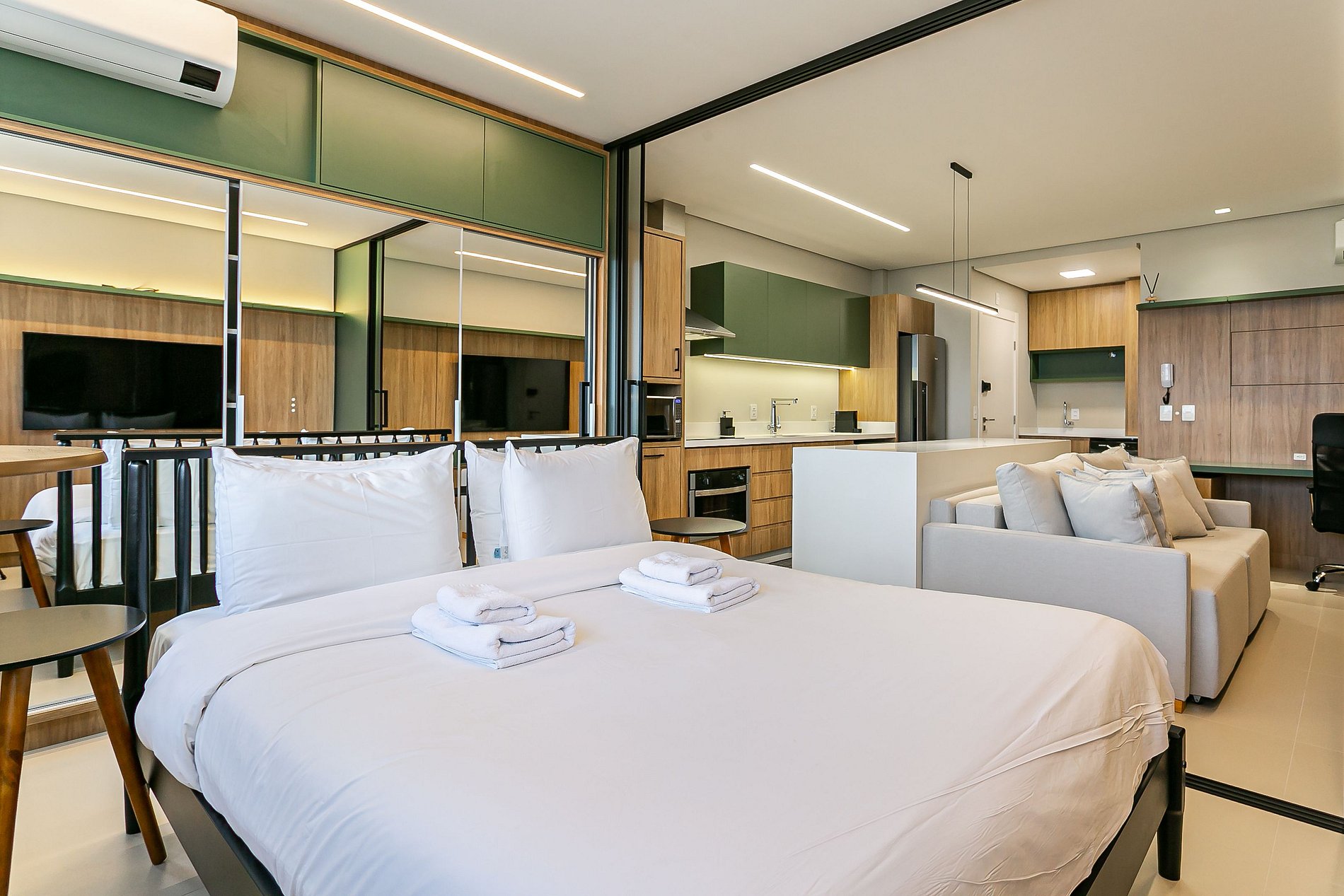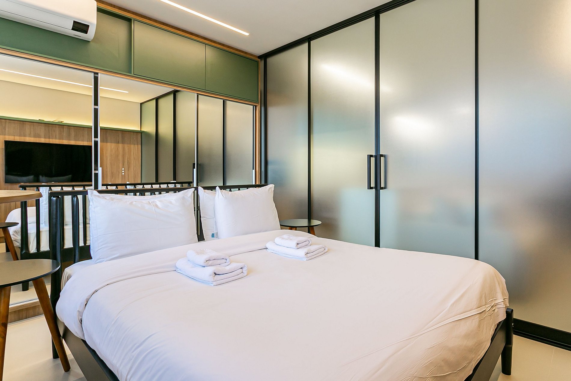 Stúdio possui 46 m2 e conta com SMARTV, ar-condicionado SPLIT e cama QUEEN.