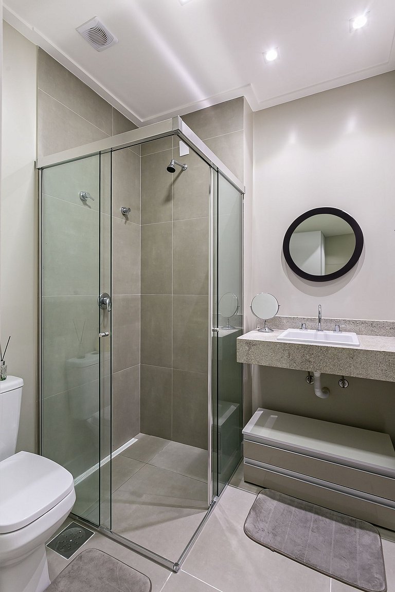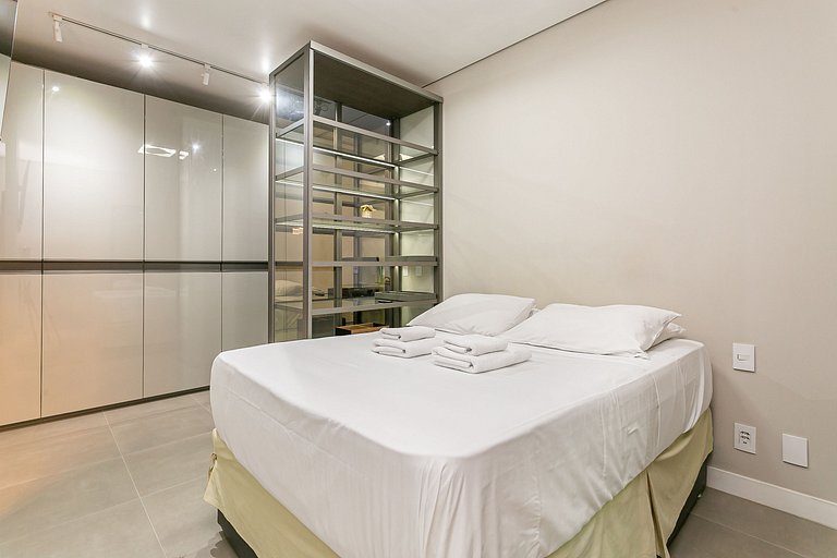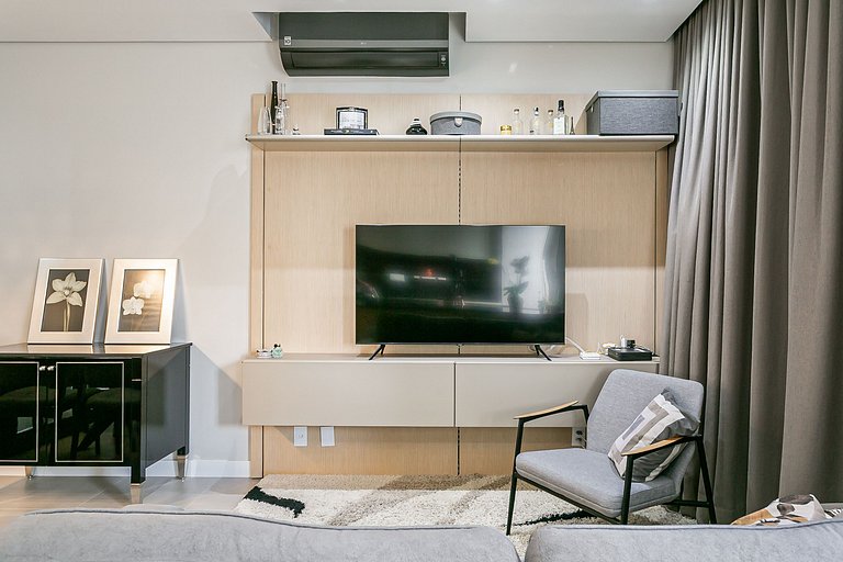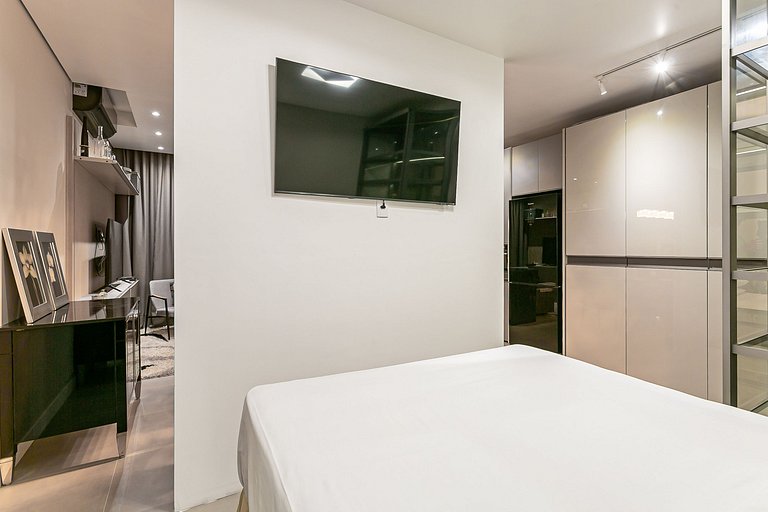 O studio de 53m² conta com uma cama QUEEN, duas Smart TVs de 55" e AC SPLIT (QUENTE E FRIO).