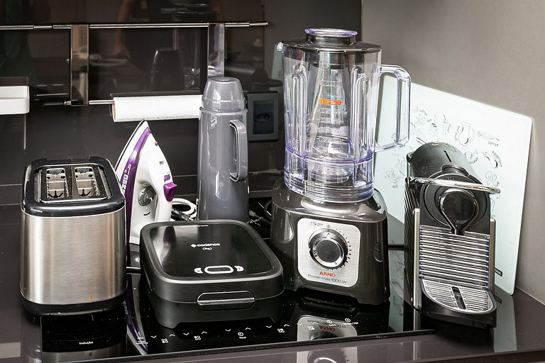 - Cozinha completa com cafeteira, geladeira com congelador, liquidificador, micro-ondas, sanduicheira, utensílios de cozinha e jogo de panelas
