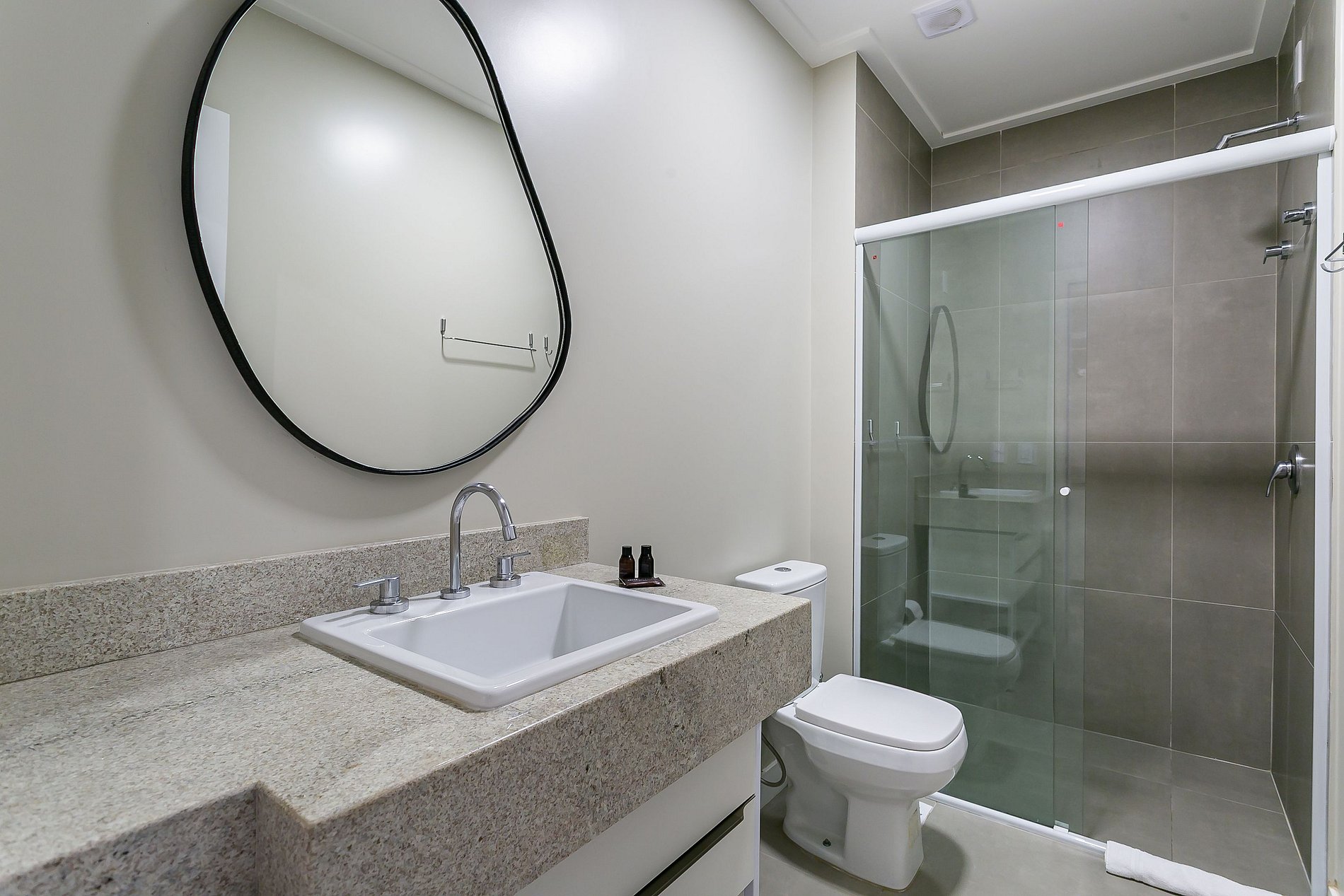- Todos os banheiros possuem amenities: um shampoo, um condicionador, um sabonete e um rolo de papel higiênico.