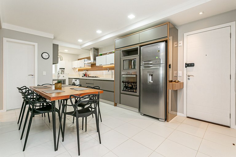 - Cozinha completa com cafeteira, geladeira com congelador, liquidificador, micro-ondas, sanduicheira, utensílios de cozinha e jogo de panelas