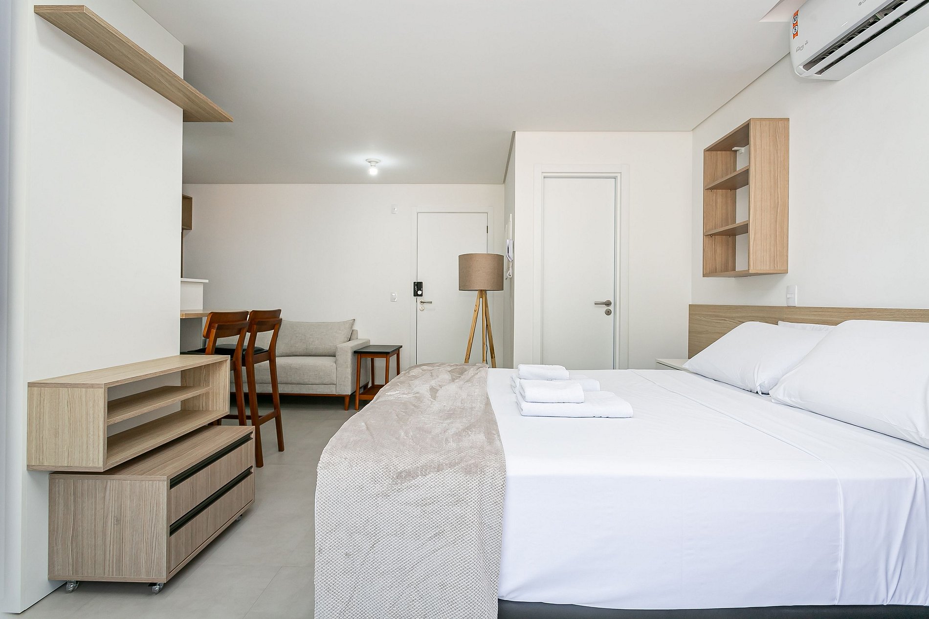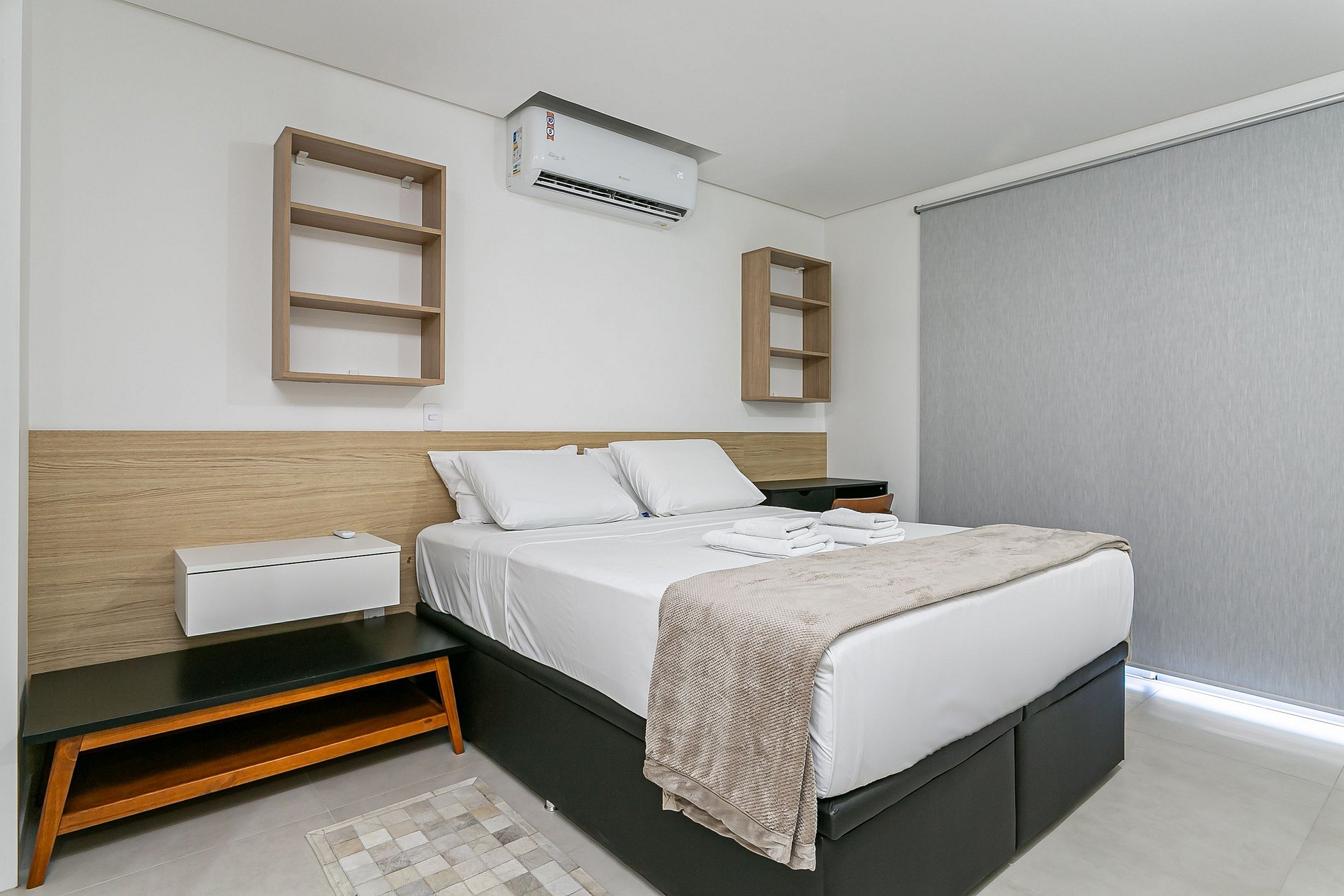 O imóvel de 39m² conta com uma CAMA QUEEN, SMART TV DE 50" E AC SPLIT.