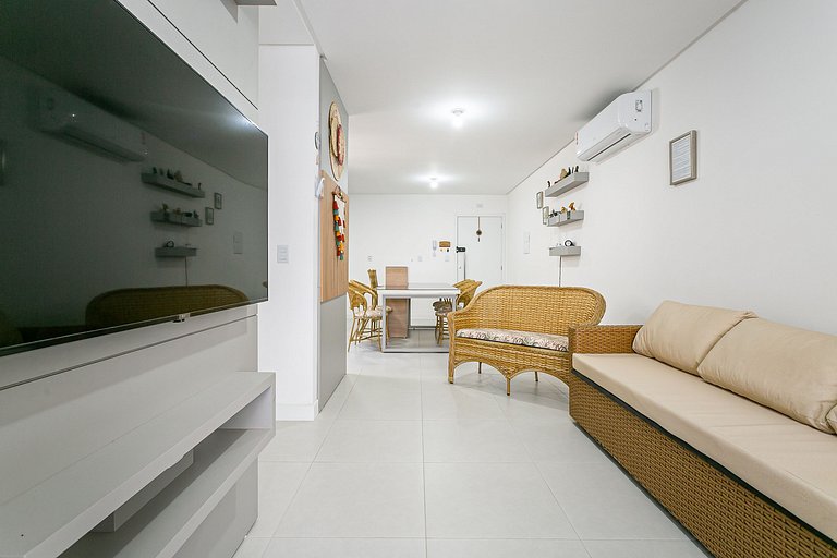 O imóvel conta com uma suíte com uma CAMA QUEEN, um quarto com uma CAMA QUEEN e uma CAMA DE SOLTEIRO, uma varanda com churrasqueira, além de uma sala de estar equipada com Smart TV de 50". Todos os cômodos são equipados com AC SPLIT.