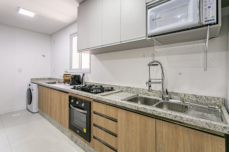 - Cozinha completa com cafeteira, geladeira com congelador, liquidificador, máquina lava-louças, micro-ondas, sanduicheira, utensílios de cozinha e jogo de panelas