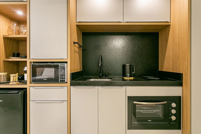 - Cozinha completa com cafeteira, frigobar, liquidificador, sanduicheira, utensílios de cozinha e jogo de panelas