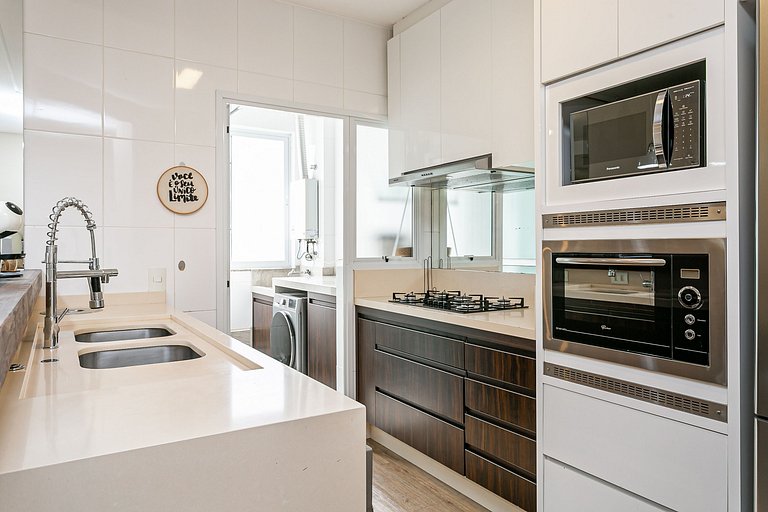 - Cozinha completa com cafeteira, geladeira com congelador, liquidificador, micro-ondas, sanduicheira, utensílios de cozinha e jogo de panelas