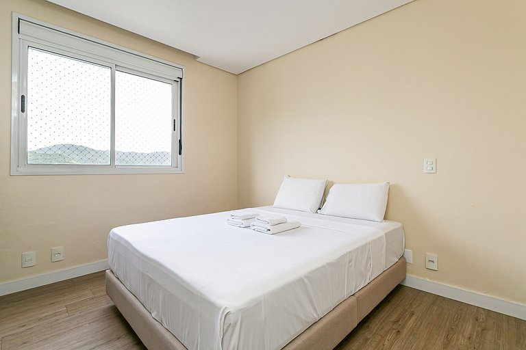 O imóvel de 87,37m² conta com uma suíte com uma CAMA QUEEN, um quarto com uma CAMA DE SOLTEIRO, sala de estar com um SOFÁ-CAMA DE SOLTEIRO e Smart TV de 43" e uma varanda com churrasqueira. Todos os quartos possuem AC SPLIT (SÓ FRIO).