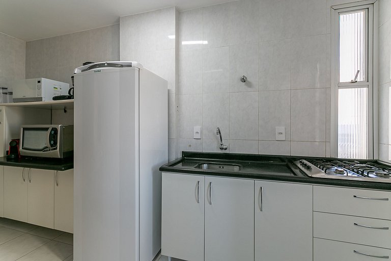 - Cozinha completa com cafeteira, geladeira com congelador, liquidificador, micro-ondas, sanduicheira, utensílios de cozinha e jogo de panelas