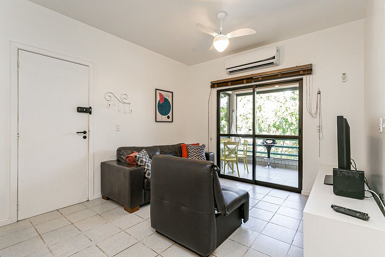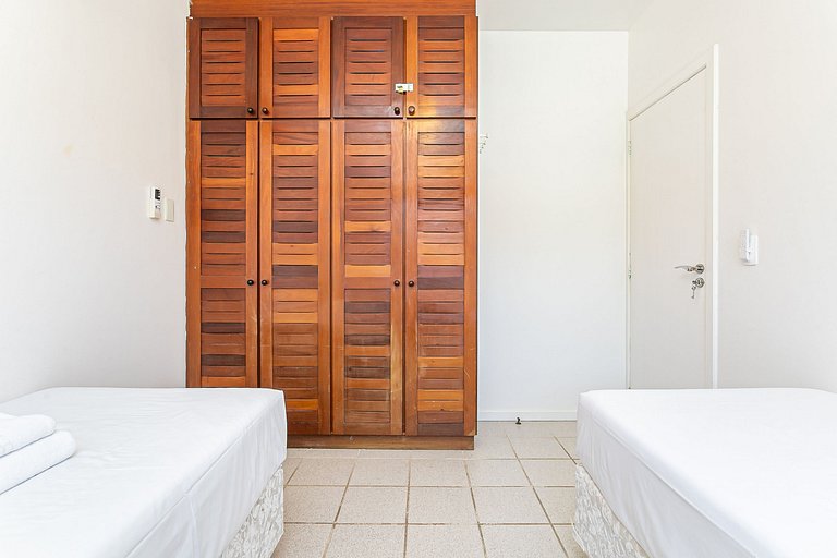 O imóvel de 71,20m² conta com uma suíte com uma CAMA QUEEN, um quarto com duas CAMAS DE SOLTEIRO, uma sala de estar equipada com uma TV de 43" com BOX TV, além de uma varanda com uma churrasqueira. Ambos os quartos contam com AC SPLIT (SÓ FRIO).