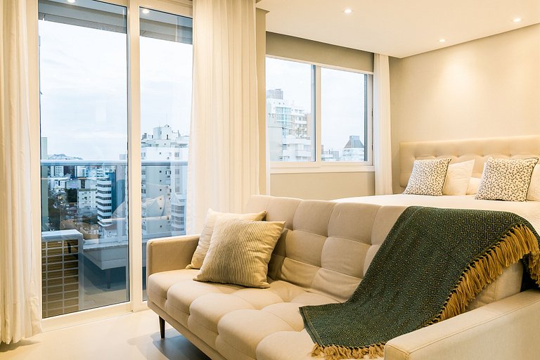 O imóvel de 47m² conta com Smart TV, Ar-condicionado SPLIT, uma Cama QUEEN e um Sofá-cama de SOLTEIRO.