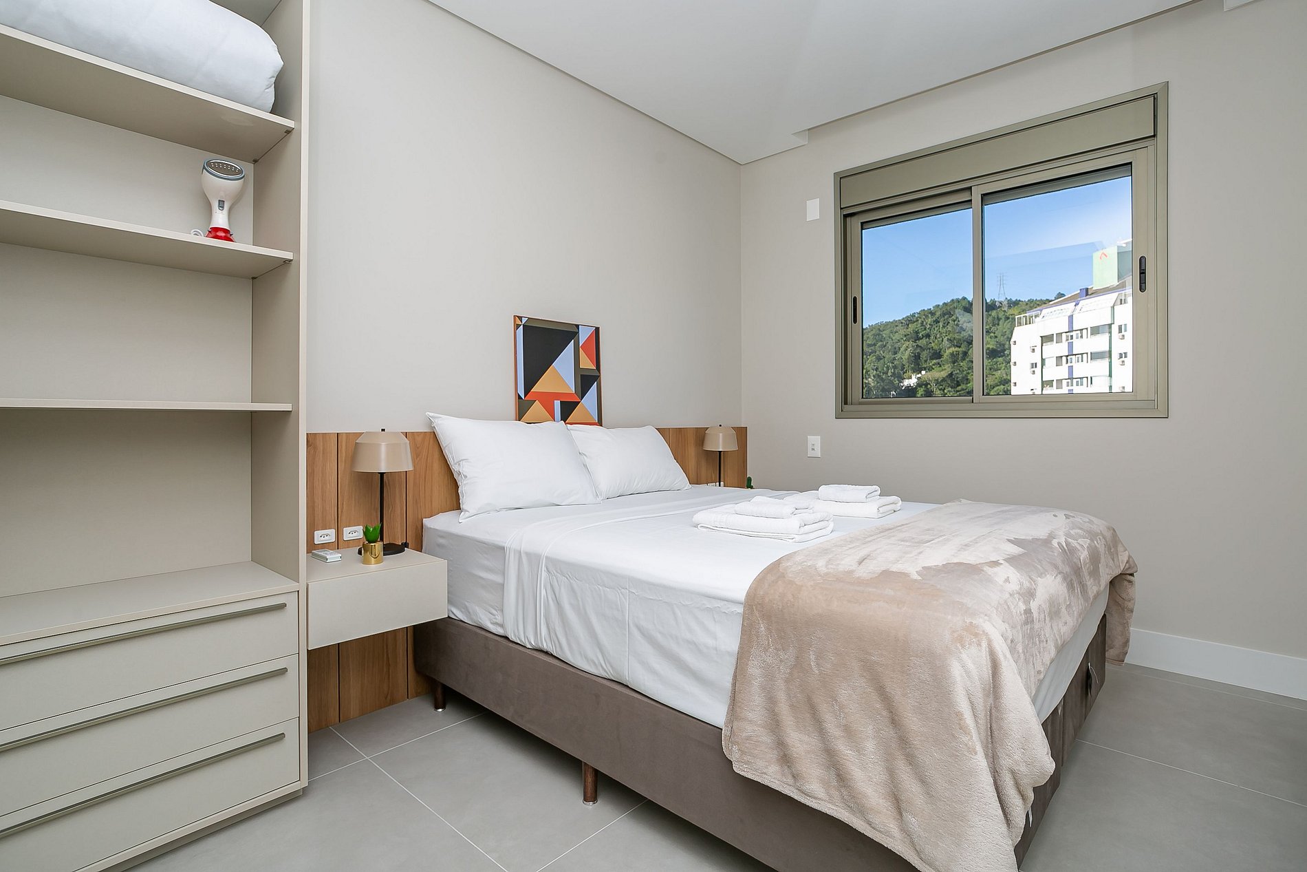 O imóvel de 62m² conta com um quarto com uma cama QUEEN e uma Smart TV de 32", uma sala de estar com Smart TV de 50" e uma varanda com vista ampla da cidade. Todos os cômodos possuem AC SPLIT (SÓ FRIO).