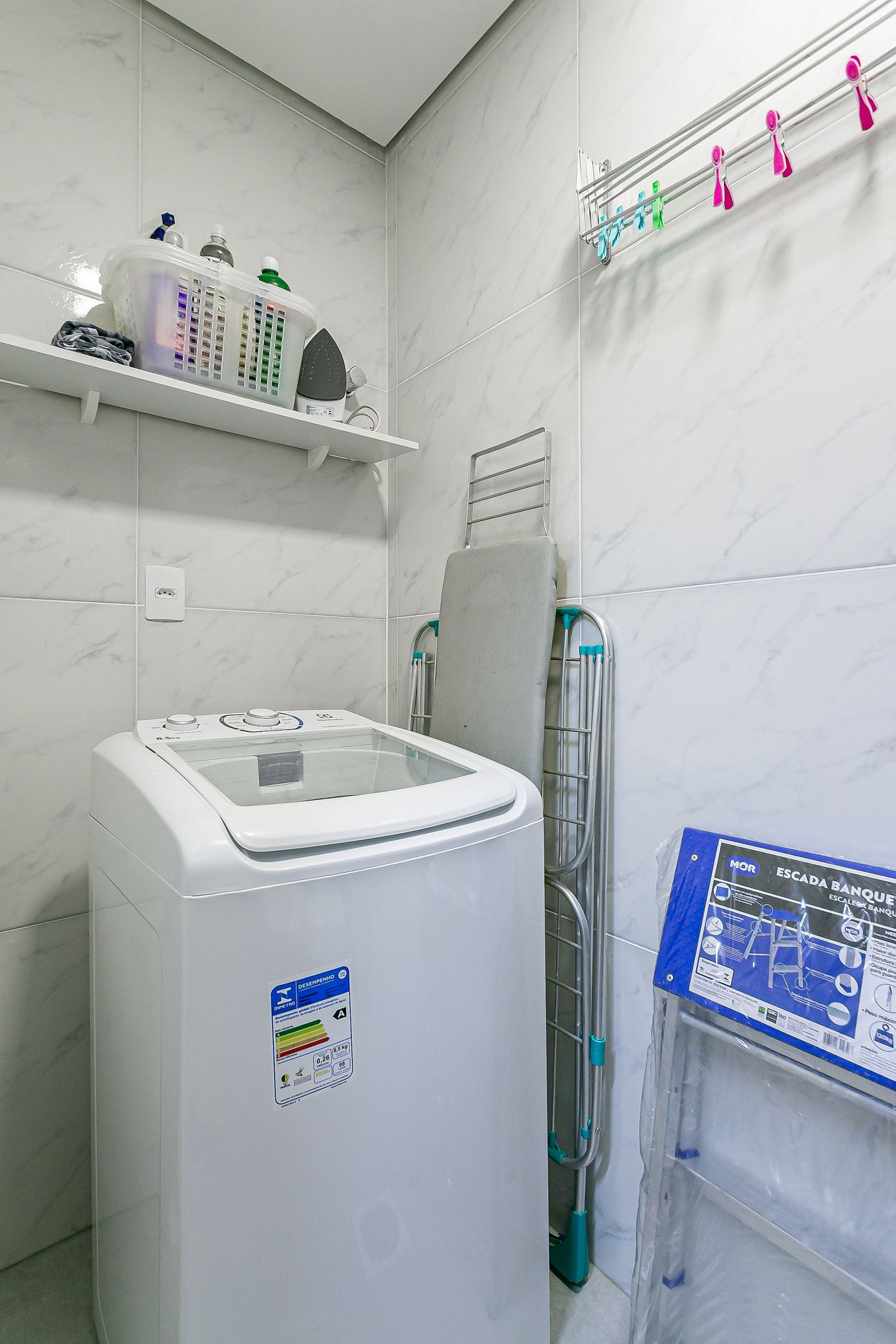- Cozinha completa com cafeteira, geladeira, liquidificador, micro-ondas, sanduicheira, utensílios de cozinha e jogo de panelas