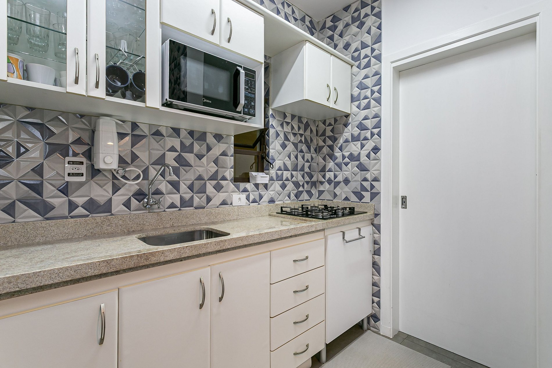 - Cozinha completa com cafeteira, geladeira, liquidificador, micro-ondas, sanduicheira, utensílios de cozinha e jogo de panelas