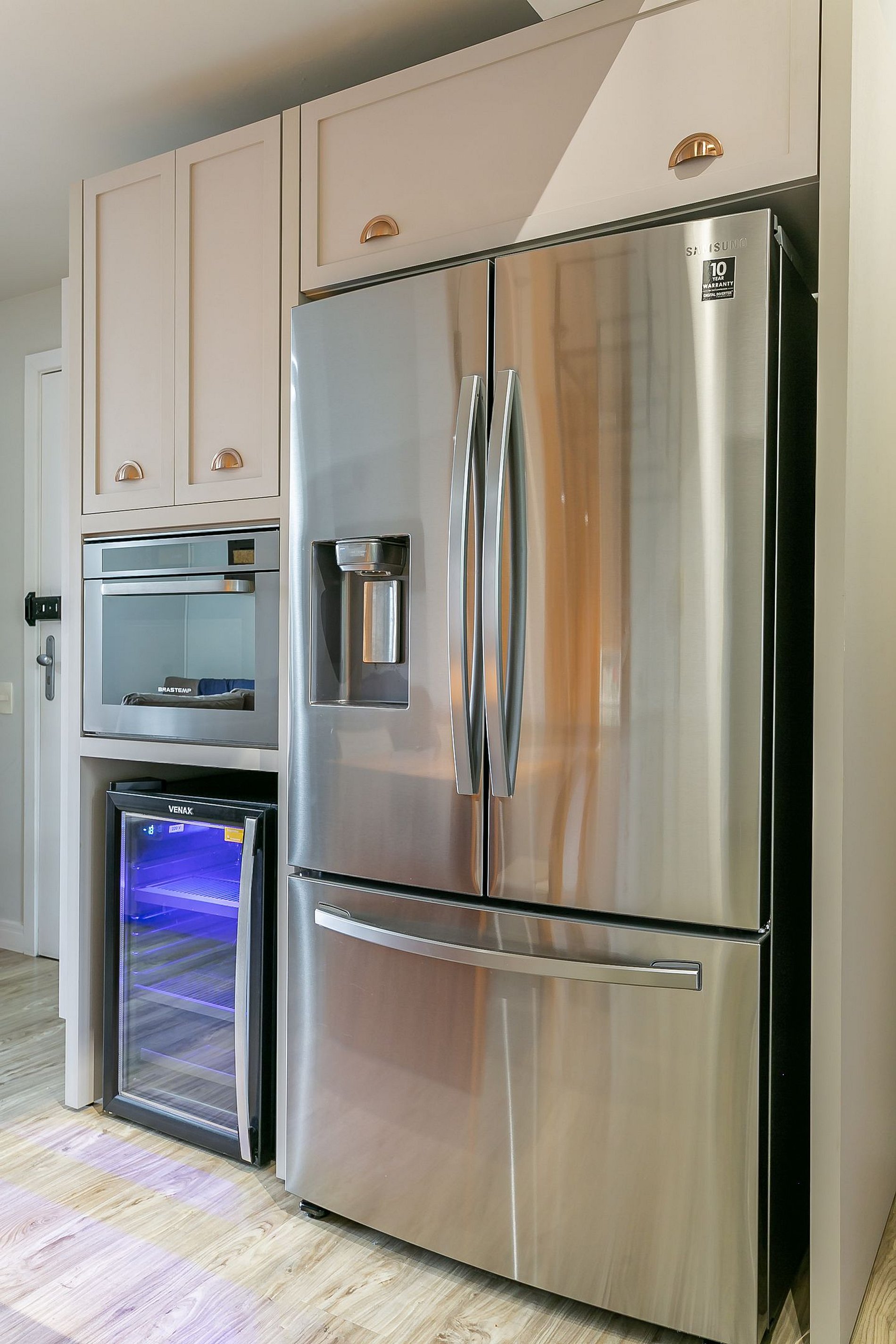 - Cozinha completa com cafeteira, liquidificador, geladeira, micro-ondas, sanduicheira, utensílios de cozinha e jogo de panelas