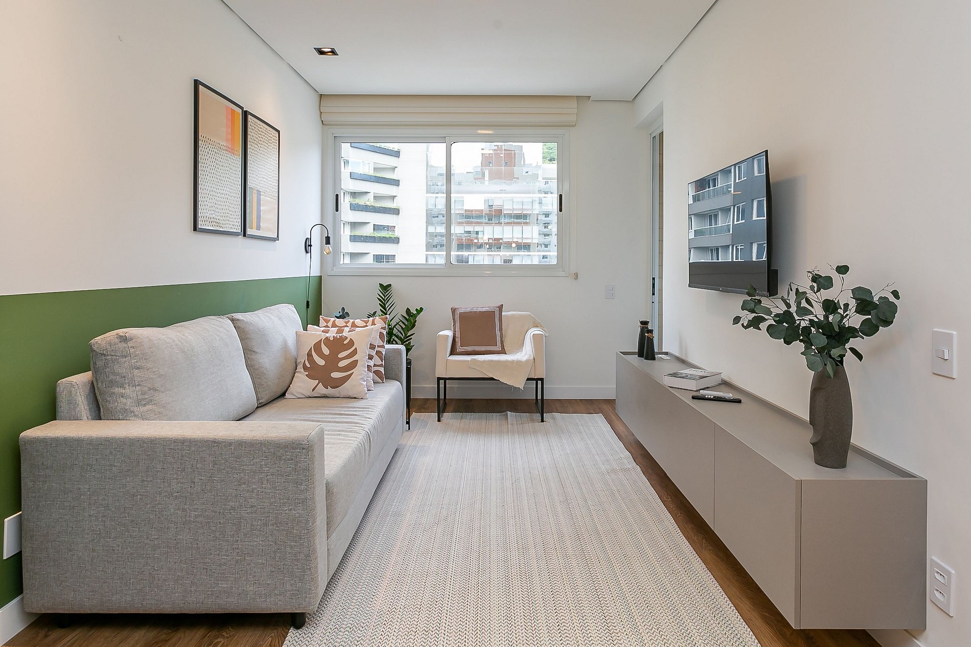 O imóvel de 66m² conta com uma suíte com cama QUEEN e Smart TV, um quarto com cama de CASAL e uma sala de estar com Smart TV. Todos os cômodos são equipados com Ar-condicionado SPLIT.