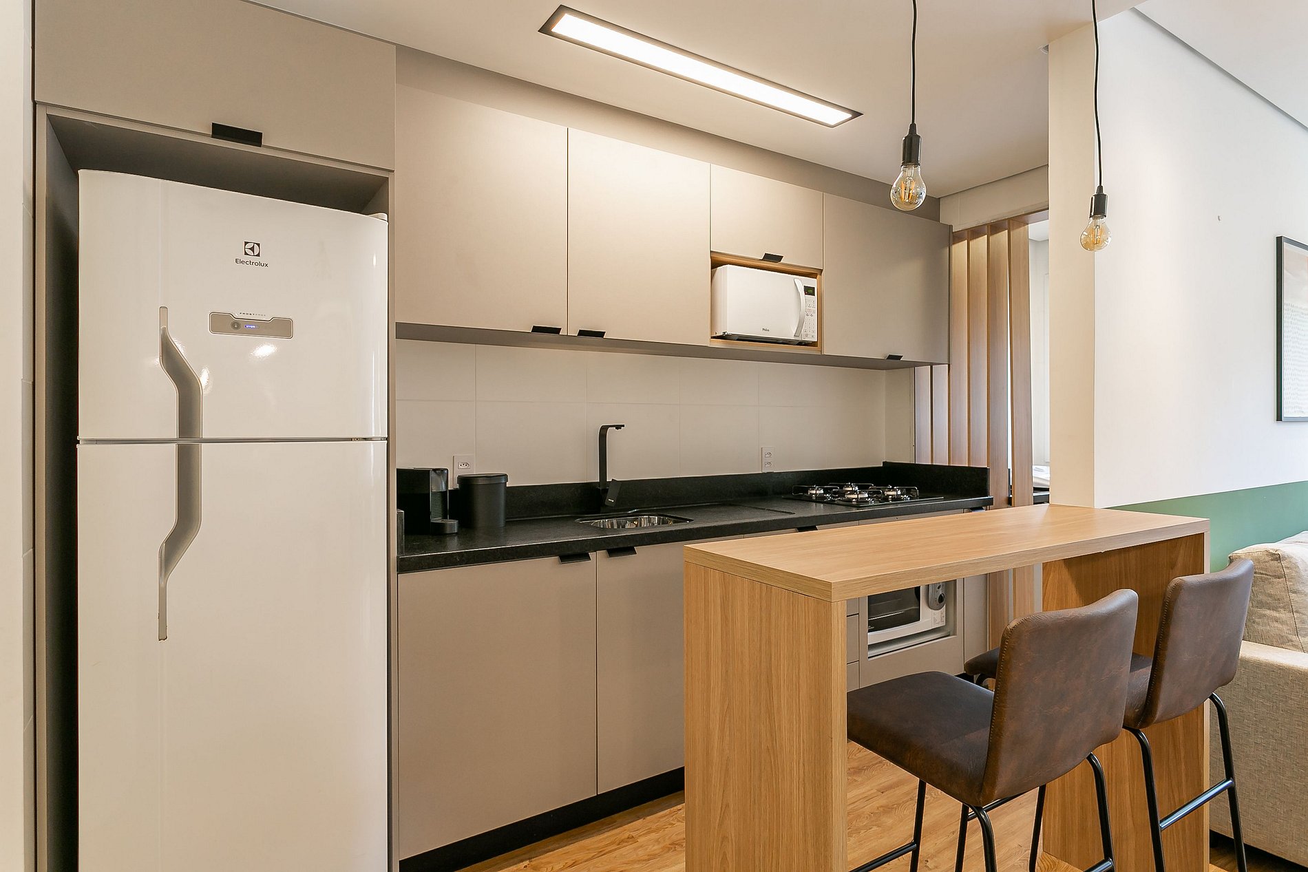 - Cozinha completa com cafeteira, geladeira com congelador, liquidificador, micro-ondas, sanduicheira, utensílios de cozinha e jogo de panelas