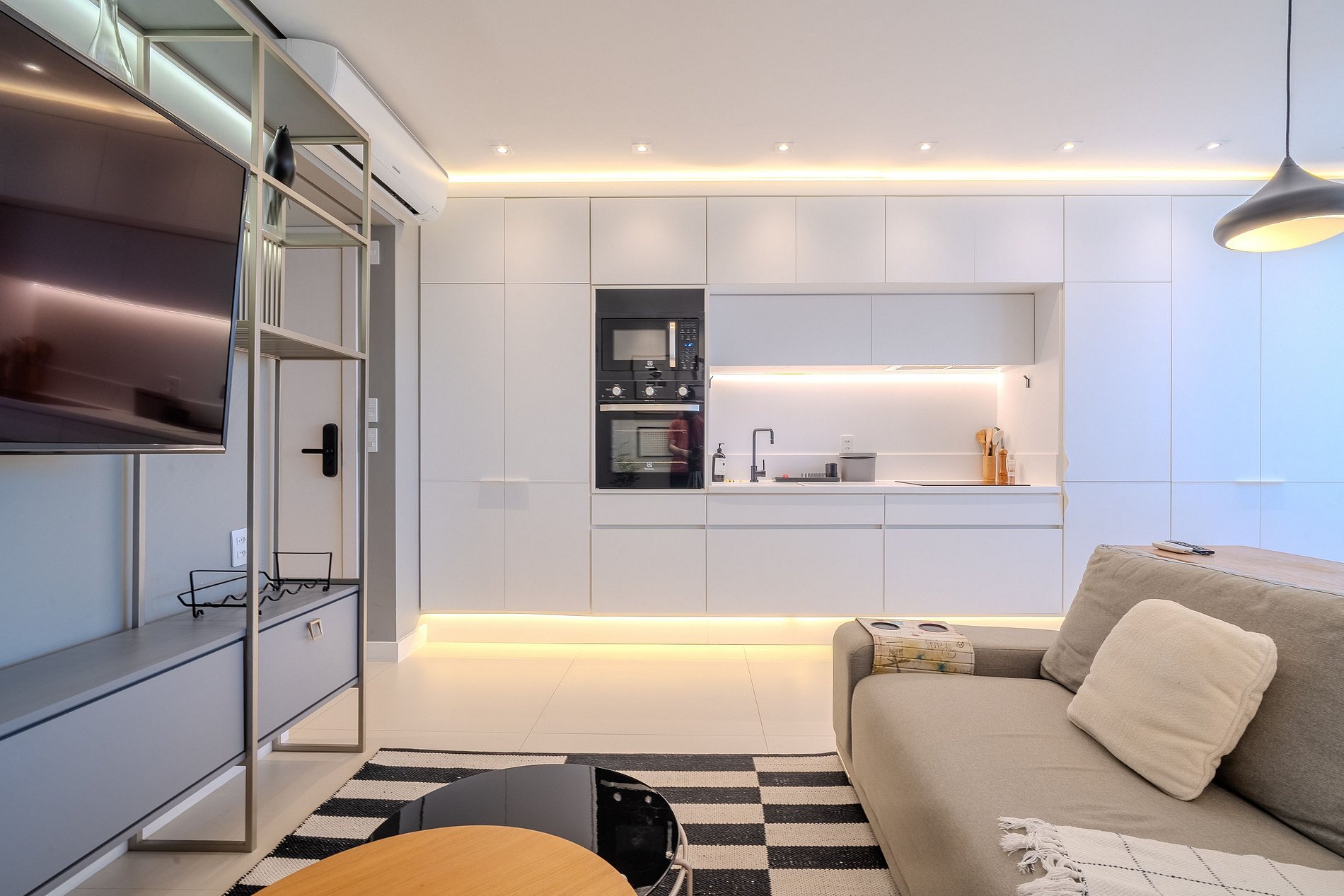 O imóvel de 40m² conta com uma CAMA QUEEN, SMART TV DE 55" E AC SPLIT (QUENTE E FRIO).