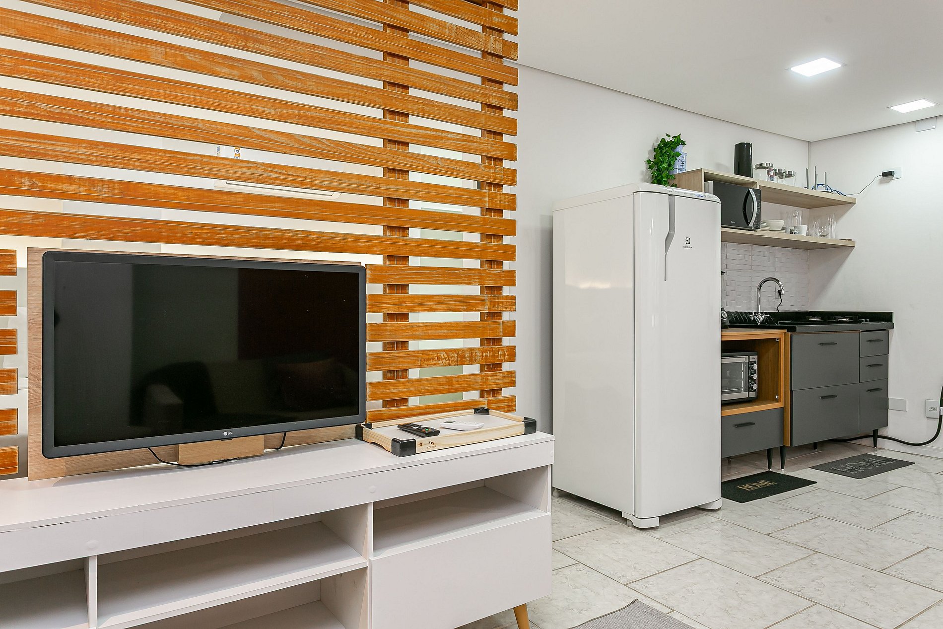 O imóvel de 33m² conta com uma CAMA QUEEN, SMART TV DE 32" E AC SPLIT (QUENTE E FRIO).