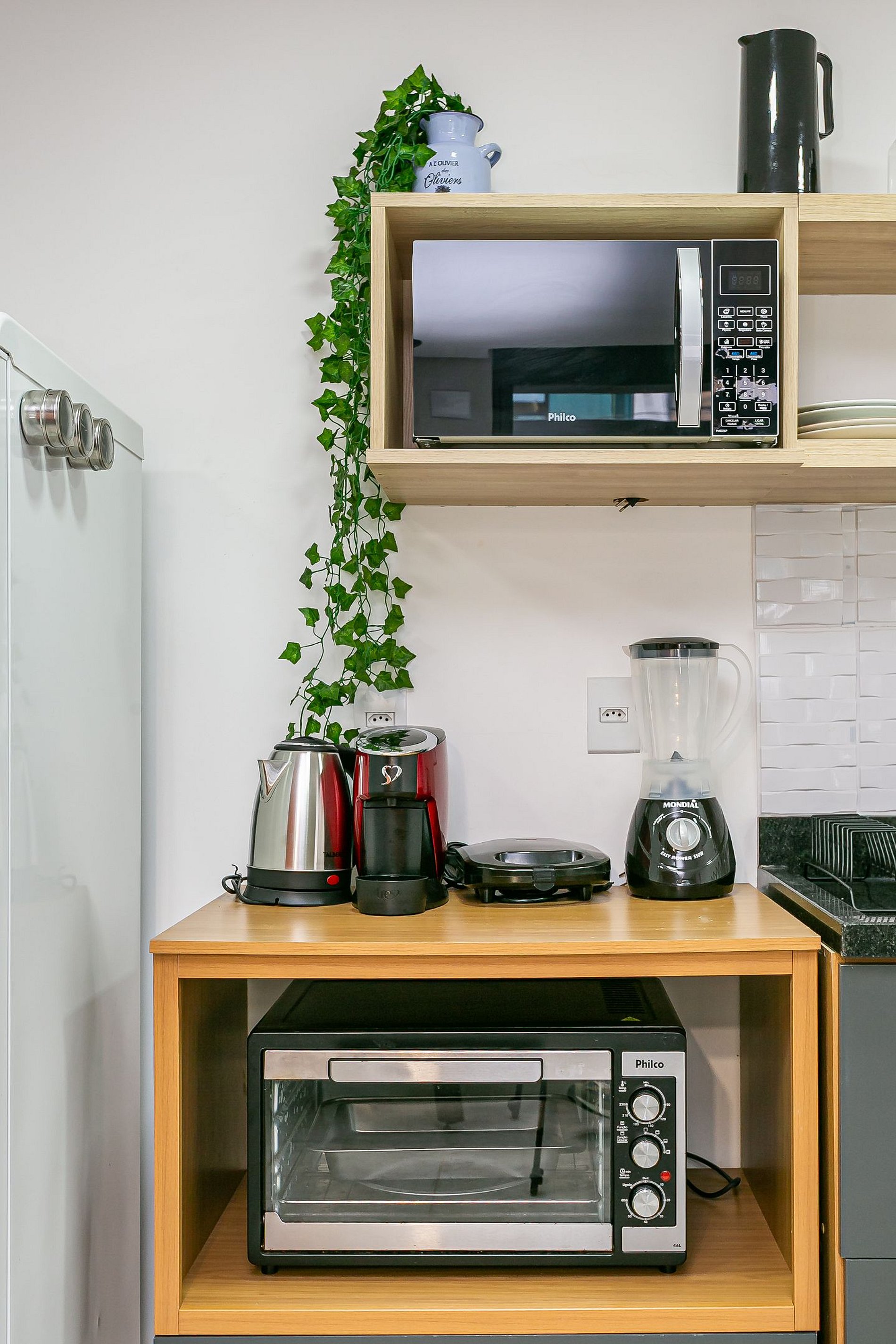 - Cozinha completa com cafeteira, geladeira com congelador, liquidificador, sanduicheira, utensílios de cozinha e jogo de panelas