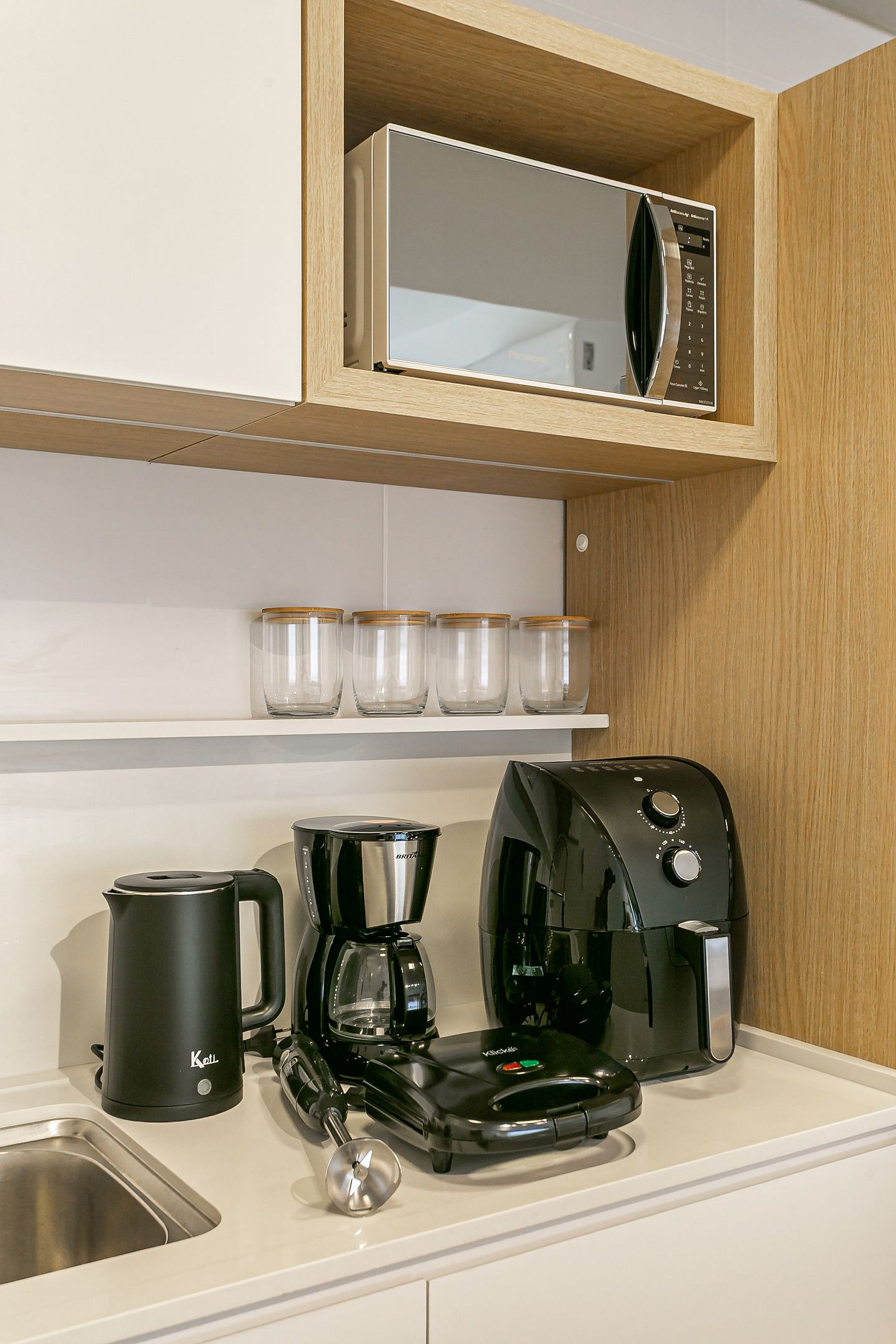 - Cozinha completa com cafeteira, geladeira com congelador, liquidificador, micro-ondas, sanduicheira, utensílios de cozinha e jogo de panelas