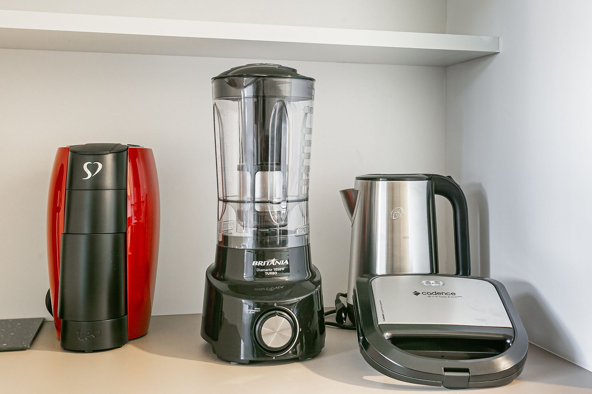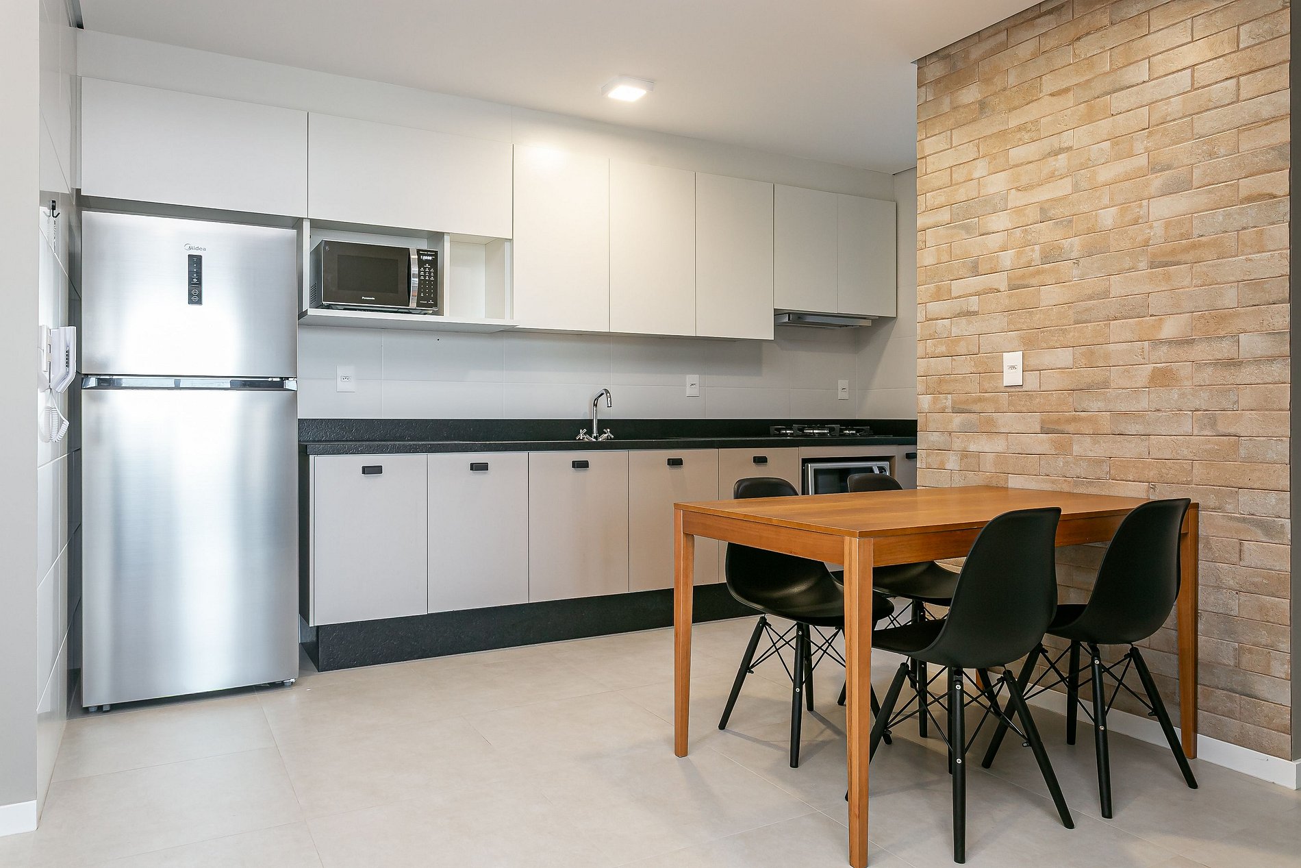 - Cozinha completa com cafeteira, geladeira com congelador, liquidificador, micro-ondas, sanduicheira, utensílios de cozinha e jogo de panelas