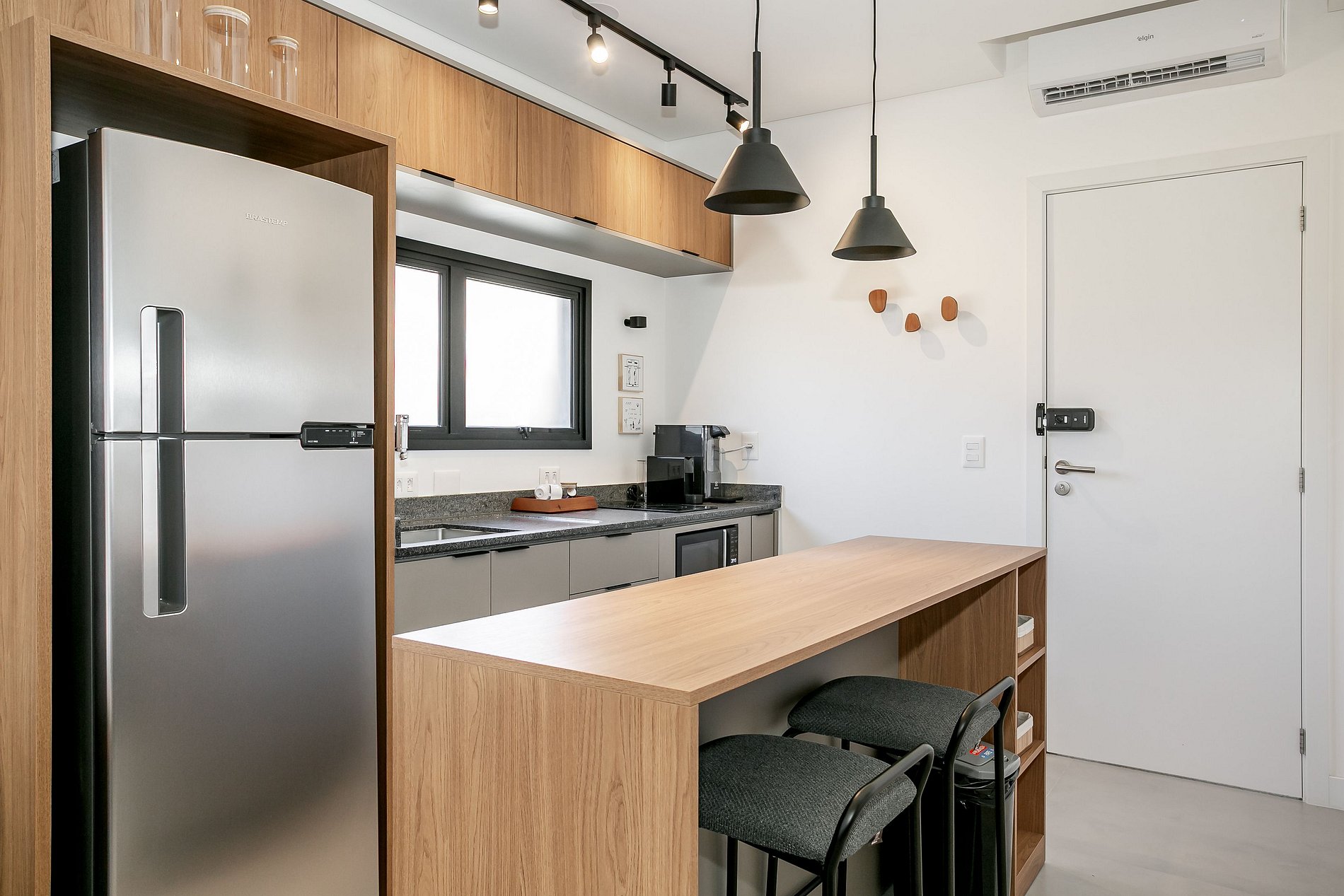 - Cozinha completa com cafeteira, geladeira com congelador, liquidificador, micro-ondas, sanduicheira, utensílios de cozinha e jogo de panelas